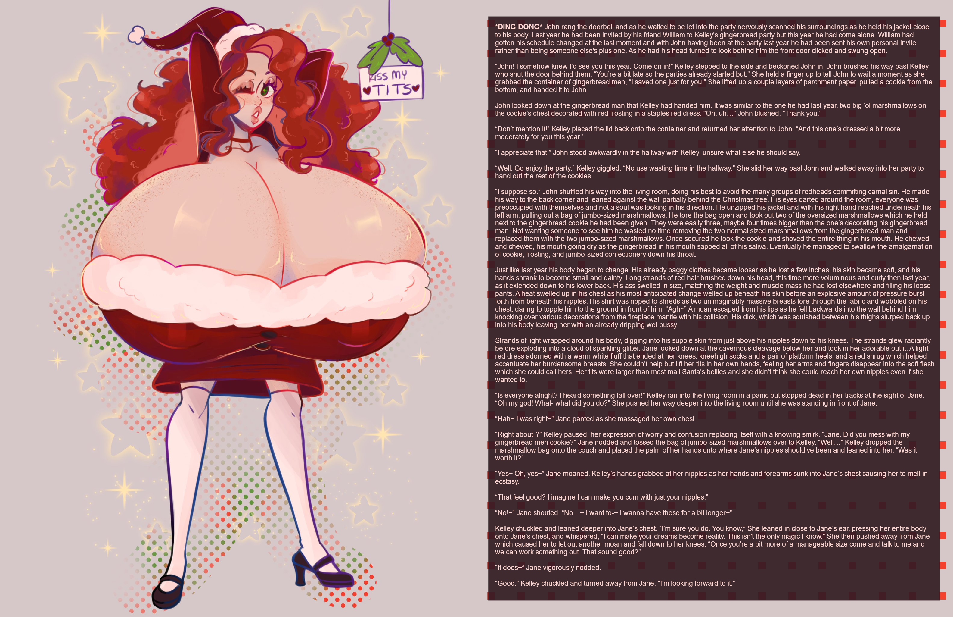 “Right about-?” Kelley paused, her expression of worry and confusion replacing itself with a knowing smirk. “Jane. Did you mess with my gingerbread men cookie?” Jane nodded and tossed the bag of jumbo-sized marshmallows over to Kelley. “Well…” Kelley dropped the marshmallow bag onto the couch and placed the palm of her hands onto where Jane’s nipples should’ve been and leaned into her. “Was it worth it?”