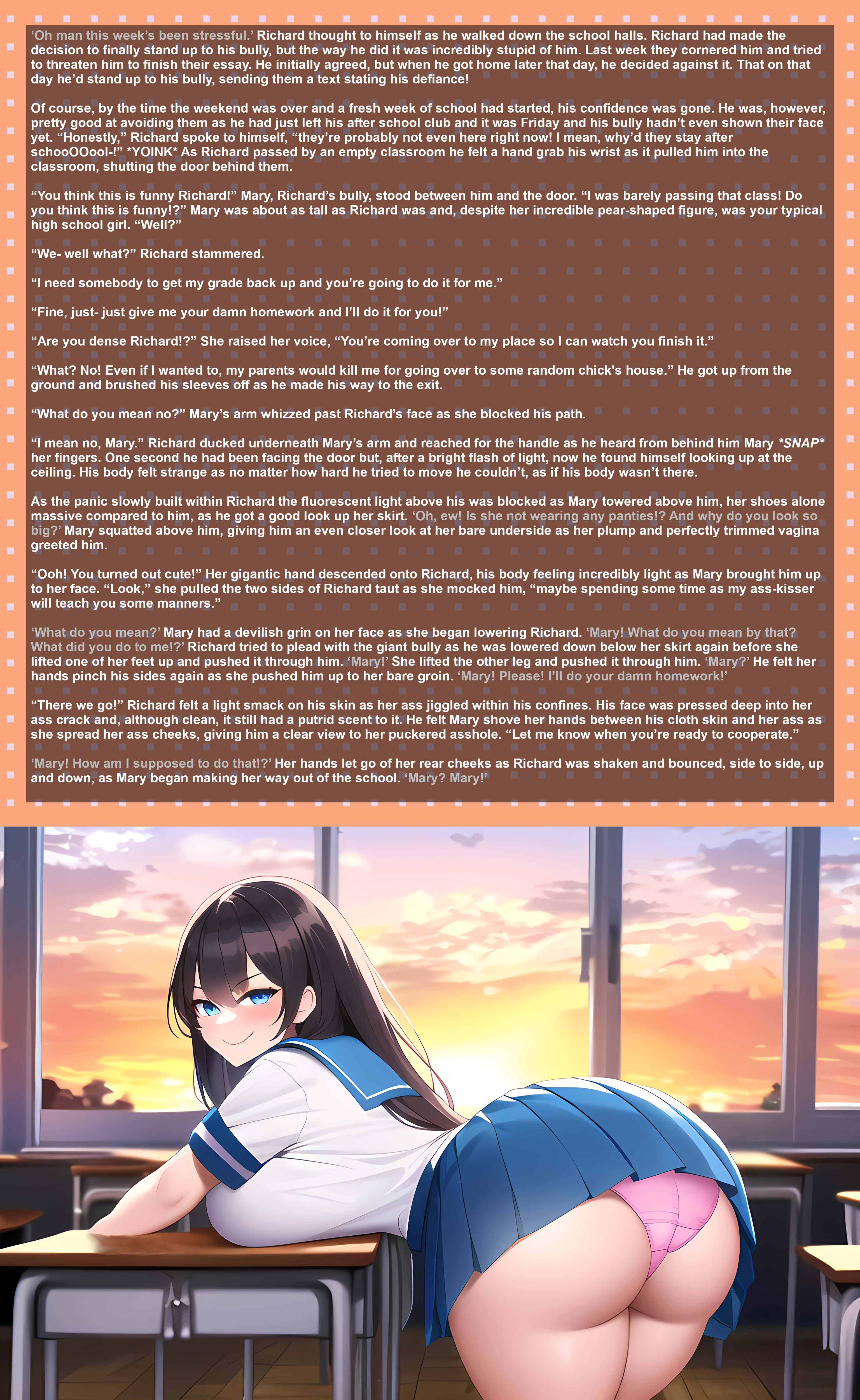 ‘What do you mean?’ Mary had a devilish grin on her face as she began lowering Richard. ‘Mary! What do you mean by that? What did you do to me!?’ Richard tried to plead with the giant bully as he was lowered down below her skirt again before she lifted one of her feet up and pushed it through him. ‘Mary!’ She lifted the other leg and pushed it through him. ‘Mary?’ He felt her hands pinch his sides again as she pushed him up to her bare groin. ‘Mary! Please! I’ll do your damn homework!’