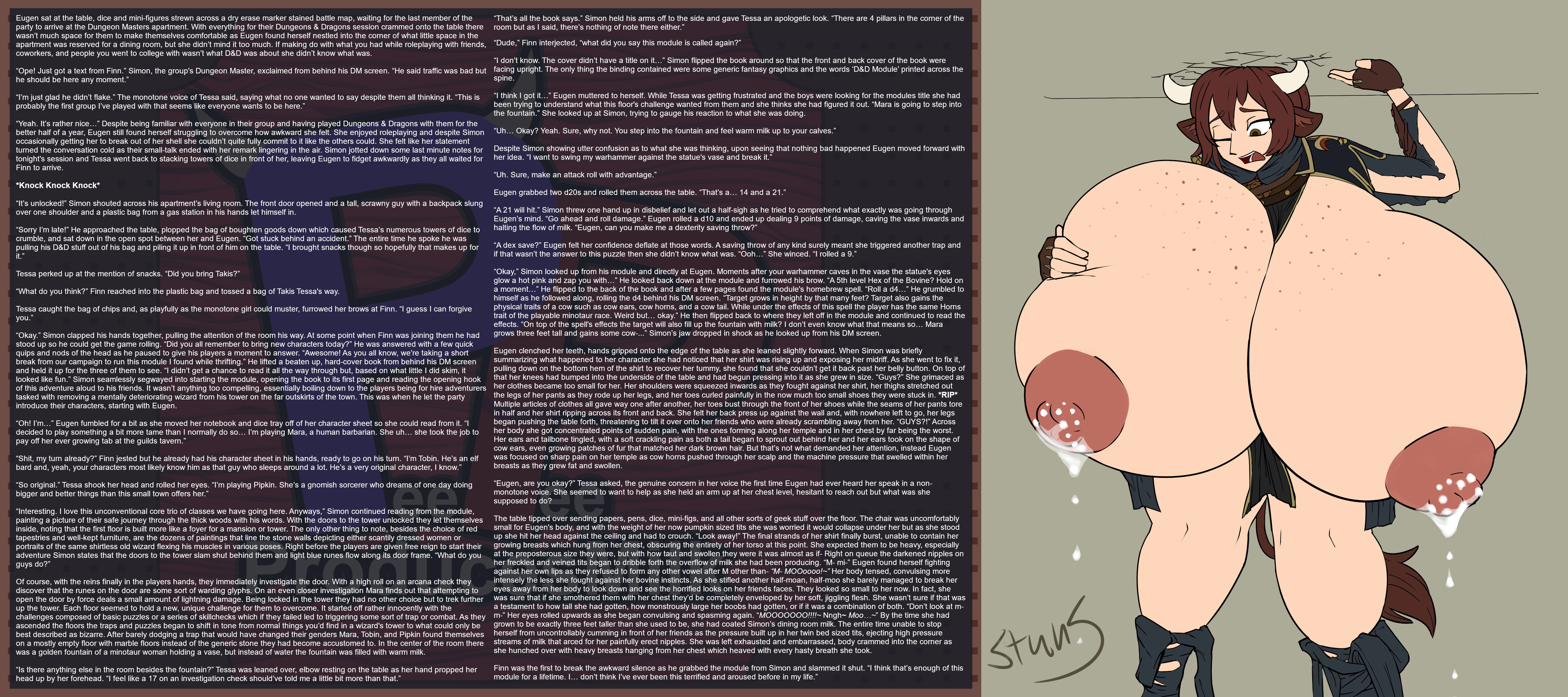 The table tipped over sending papers, pens, dice, mini-figs, and all other sorts of geek stuff over the floor. The chair was uncomfortably small for Eugen's body, and with the weight of her now pumpkin sized tits she was worried it would collapse under her but as she stood up she hit her head against the ceiling and had to crouch. “Look away!” The final strands of her shirt finally burst, unable to contain her growing breasts which hung from her chest, obscuring the entirety of her torso at this point. She expected them to be heavy, especially at the preposterous size they were, but with how taut and swollen they were it was almost as if- Right on queue the darkened nipples on her freckled and veined tits began to dribble forth the overflow of milk she had been producing. “M- mi-” Eugen found herself fighting against her own lips as they refused to form any other vowel after M other than- “M- MOOoooo!~” Her body tensed, convulsing more intensely the less she fought against her bovine instincts. As she stifled another half-moan, half-moo she barely managed to break her eyes away from her body to look down and see the horrified looks on her friends faces. They looked so small to her now. In fact, she was sure that if she smothered them with her chest they’d be completely enveloped by her soft, jiggling flesh. She wasn’t sure if that was a testament to how tall she had gotten, how monstrously large her boobs had gotten, or if it was a combination of both. “Don’t look at m- m-” Her eyes rolled upwards as she began convulsing and spasming again. “MOOOOOOO!!!!~ Nngh~ Moo…~” By the time she had grown to be exactly three feet taller than she used to be, she had coated Simon’s dining room milk. The entire time unable to stop herself from uncontrollably cumming in front of her friends as the pressure built up in her twin bed sized tits, ejecting high pressure streams of milk that arced for her painfully erect nipples. She was left exhausted and embarrassed, body crammed into the corner as she hunched over with heavy breasts hanging from her chest which heaved with every hasty breath she took.