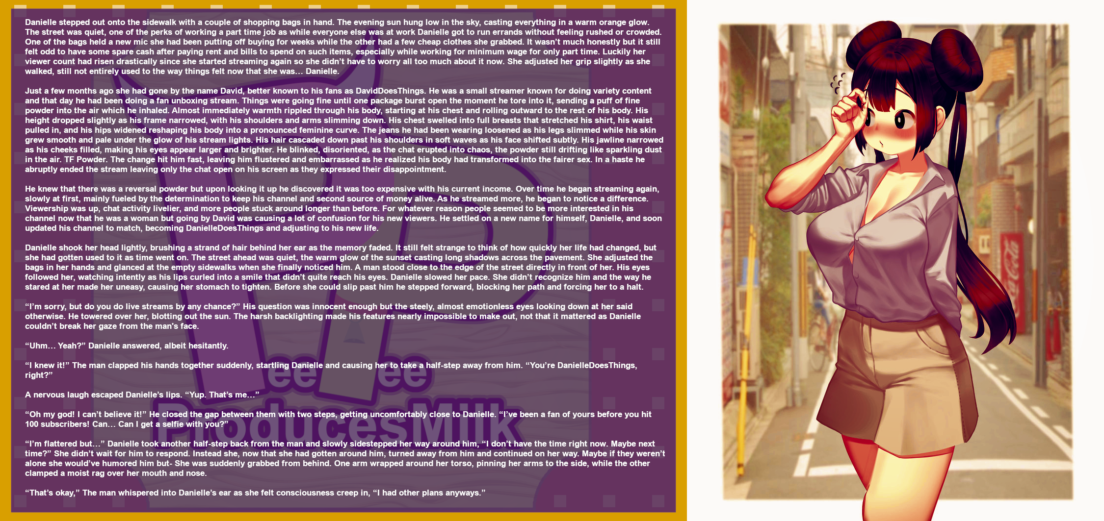 He knew that there was a reversal powder but upon looking it up he discovered it was too expensive with his current income. Over time he began streaming again, slowly at first, mainly fueled by the determination to keep his channel and second source of money alive. As he streamed more, he began to notice a difference. Viewership was up, chat activity livelier, and more people stuck around longer than before. For whatever reason people seemed to be more interested in his channel now that he was a woman but going by David was causing a lot of confusion for his new viewers. He settled on a new name for himself, Danielle, and soon updated his channel to match, becoming DanielleDoesThings and adjusting to his new life.