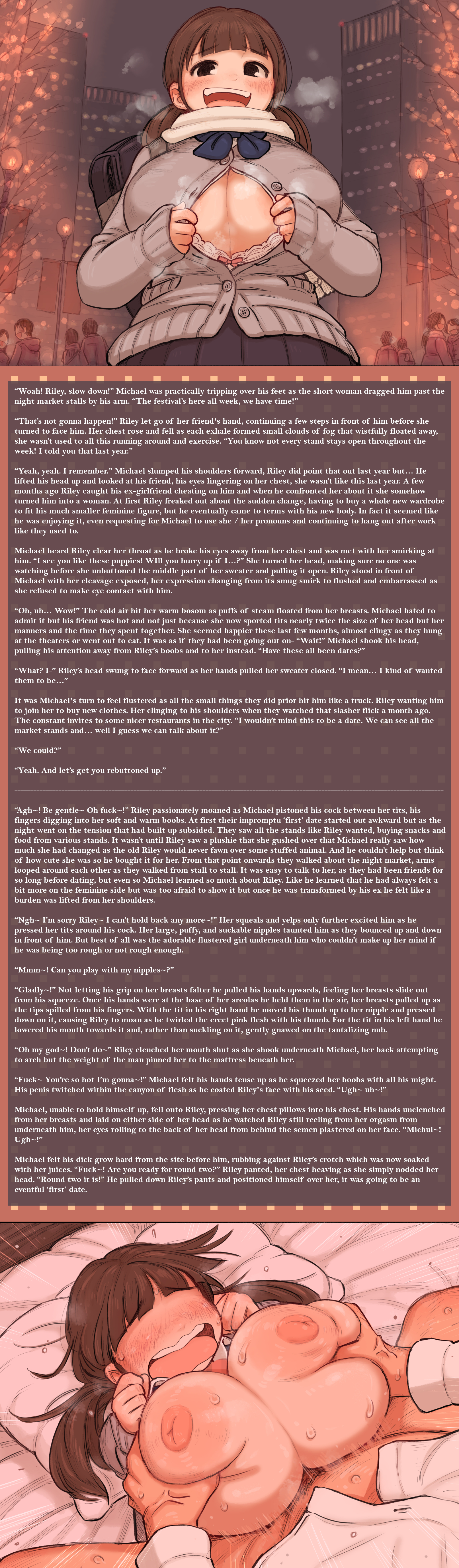 “Agh~! Be gentle~ Oh fuck~!” Riley passionately moaned as Michael pistoned his cock between her tits, his fingers digging into her soft and warm boobs. At first their impromptu ‘first’ date started out awkward but as the night went on the tension that had built up subsided. They saw all the stands like Riley wanted, buying snacks and food from various stands. It wasn’t until Riley saw a plushie that she gushed over that Michael really saw how much she had changed as the old Riley would never fawn over some stuffed animal. And he couldn’t help but think of how cute she was so he bought it for her. From that point onwards they walked about the night market, arms looped around each other as they walked from stall to stall. It was easy to talk to her, as they had been friends for so long before dating, but even so Michael learned so much about Riley. Like he learned that he had always felt a bit more on the feminine side but was too afraid to show it but once he was transformed by his ex he felt like a burden was lifted from her shoulders.