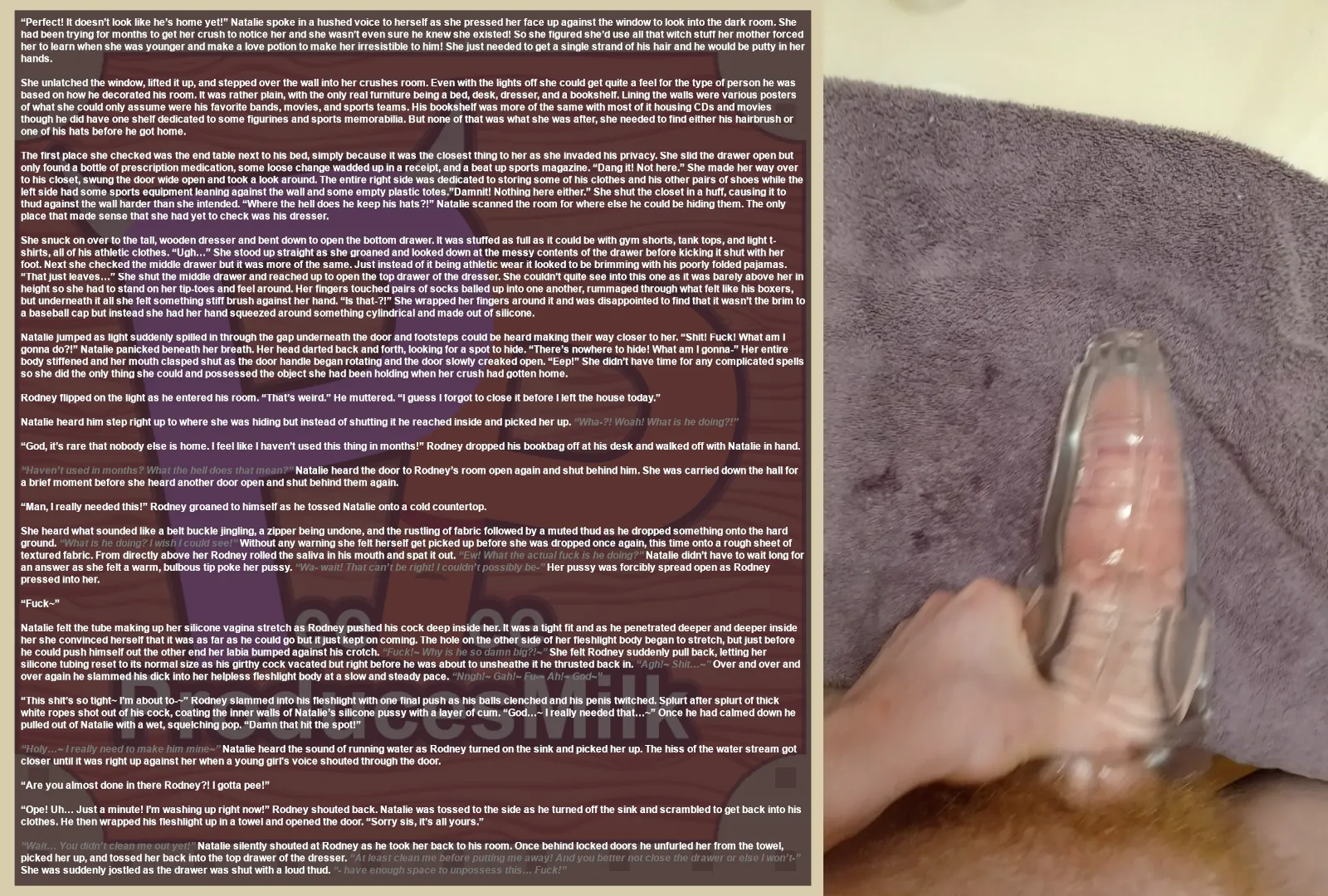Natalie felt the tube making up her silicone vagina stretch as Rodney pushed his cock deep inside her. It was a tight fit and as he penetrated deeper and deeper inside her she convinced herself that it was as far as he could go but it just kept on coming. The hole on the other side of her fleshlight body began to stretch, but just before he could push himself out the other end her labia bumped against his crotch. “Fuck!~ Why is he so damn big?!~” She felt Rodney suddenly pull back, letting her silicone tubing reset to its normal size as his girthy cock vacated but right before he was about to unsheathe it he thrusted back in. “Agh!~ Shit…~” Over and over and over again he slammed his dick into her helpless fleshlight body at a slow and steady pace. “Nngh!~ Gah!~ Fu-~ Ah!~ God~”