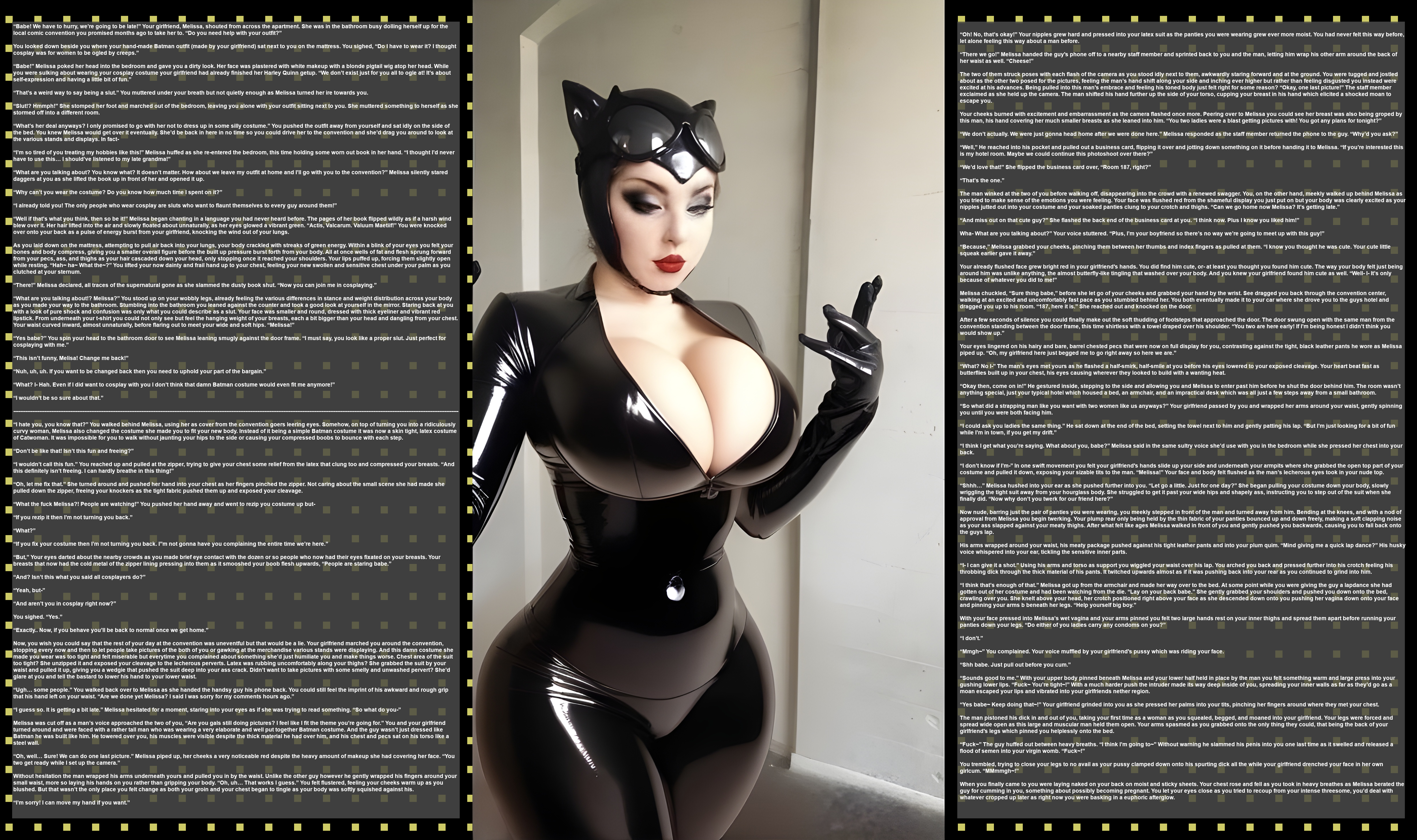 “I hate you, you know that?” You walked behind Melissa, using her as cover from the convention goers leering eyes. Somehow, on top of turning you into a ridiculously curvy woman, Melissa also changed the costume she made you to fit your new body. Instead of it being a simple Batman costume it was now a skin tight, latex costume of Catwoman. It was impossible for you to walk without jaunting your hips to the side or causing your compressed boobs to bounce with each step.