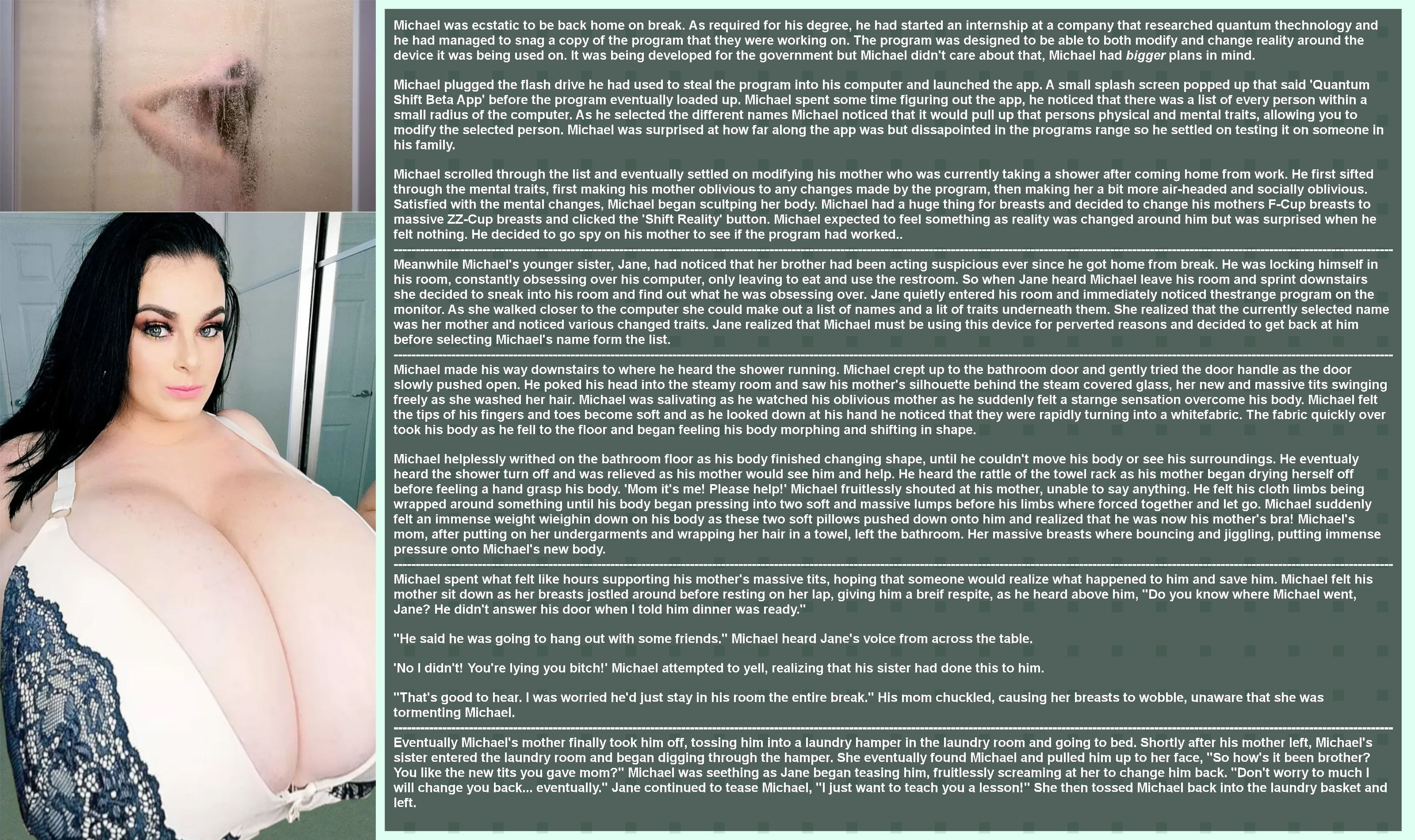 Michael scrolled through the list and eventually settled on modifying his mother who was currently taking a shower after coming home from work. He first sifted through the mental traits, first making his mother oblivious to any changes made by the program, then making her a bit more air-headed and socially oblivious. Satisfied with the mental changes, Michael began scultping her body. Michael had a huge thing for breasts and decided to change his mothers F-Cup breasts to massive ZZ-Cup breasts and clicked the 'Shift Reality' button. Michael expected to feel something as reality was changed around him but was surprised when he felt nothing. He decided to go spy on his mother to see if the program had worked..