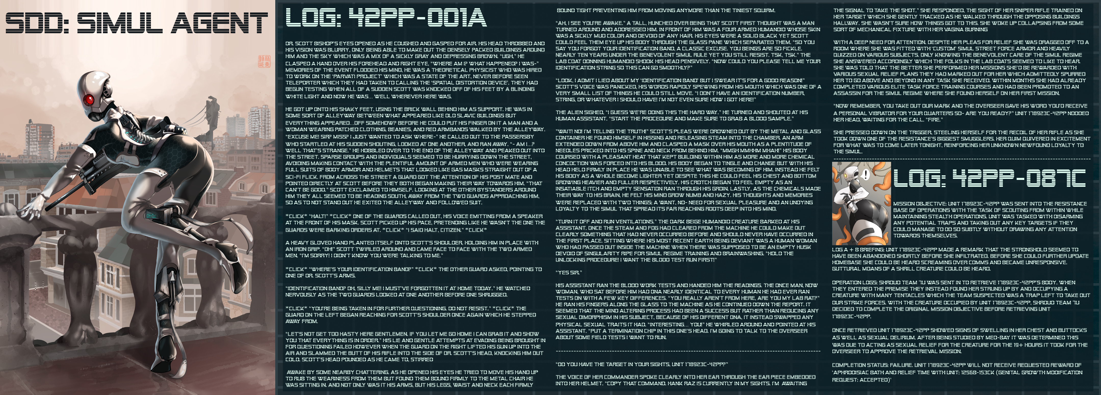 “Turn it off and run ventilations.” The dark beige humanoid creature barked at his assistant. Once the steam and fog had cleared from the machine he could make out clearly something that had never occurred before and should never have occurred in the first place. Sitting where his most recent earth being deviant was a human woman who had passed out inside the machine when there was supposed to be an empty husk devoid of singularity ripe for Simul regime training and brainwashing. “Hold the unlocking procedure! I want the blood test run first!”