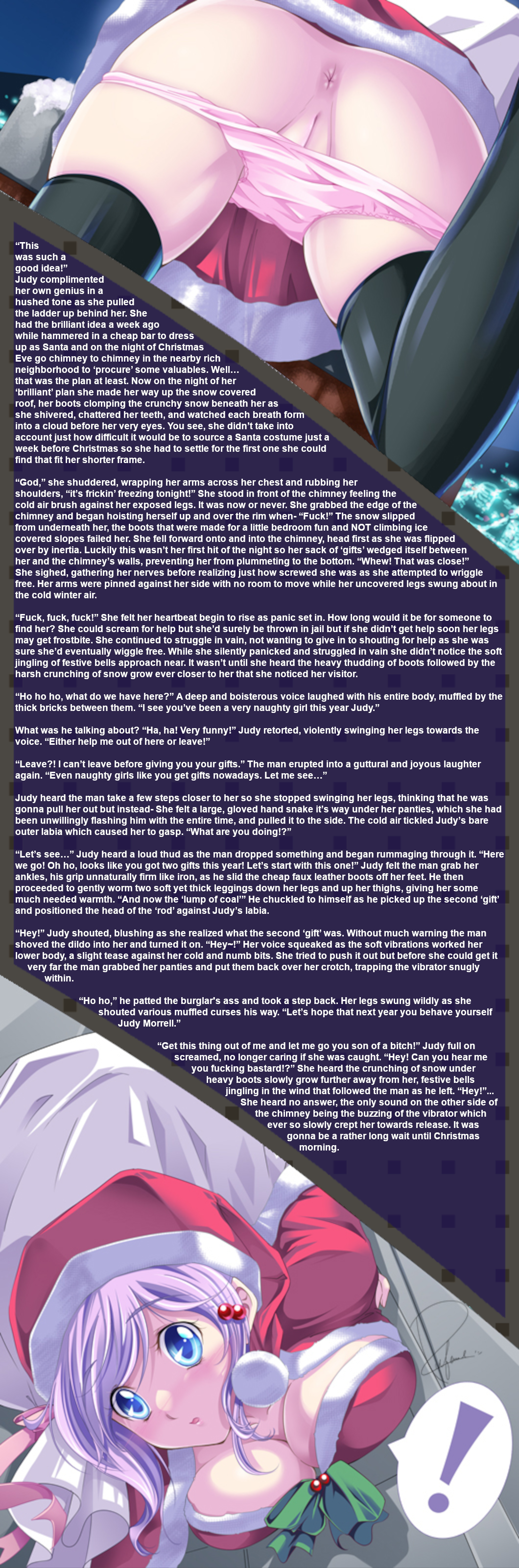 “Get this thing out of me and let me go you son of a bitch!” Judy full on screamed, no longer caring if she was caught. “Hey! Can you hear me you fucking bastard!?” She heard the crunching of snow under heavy boots slowly grow further away from her, festive bells jingling in the wind that followed the man as he left. “Hey!”… She heard no answer, the only sound on the other side of the chimney being the buzzing of the vibrator which ever so slowly crept her towards release. It was gonna be a rather long wait until Christmas morning.