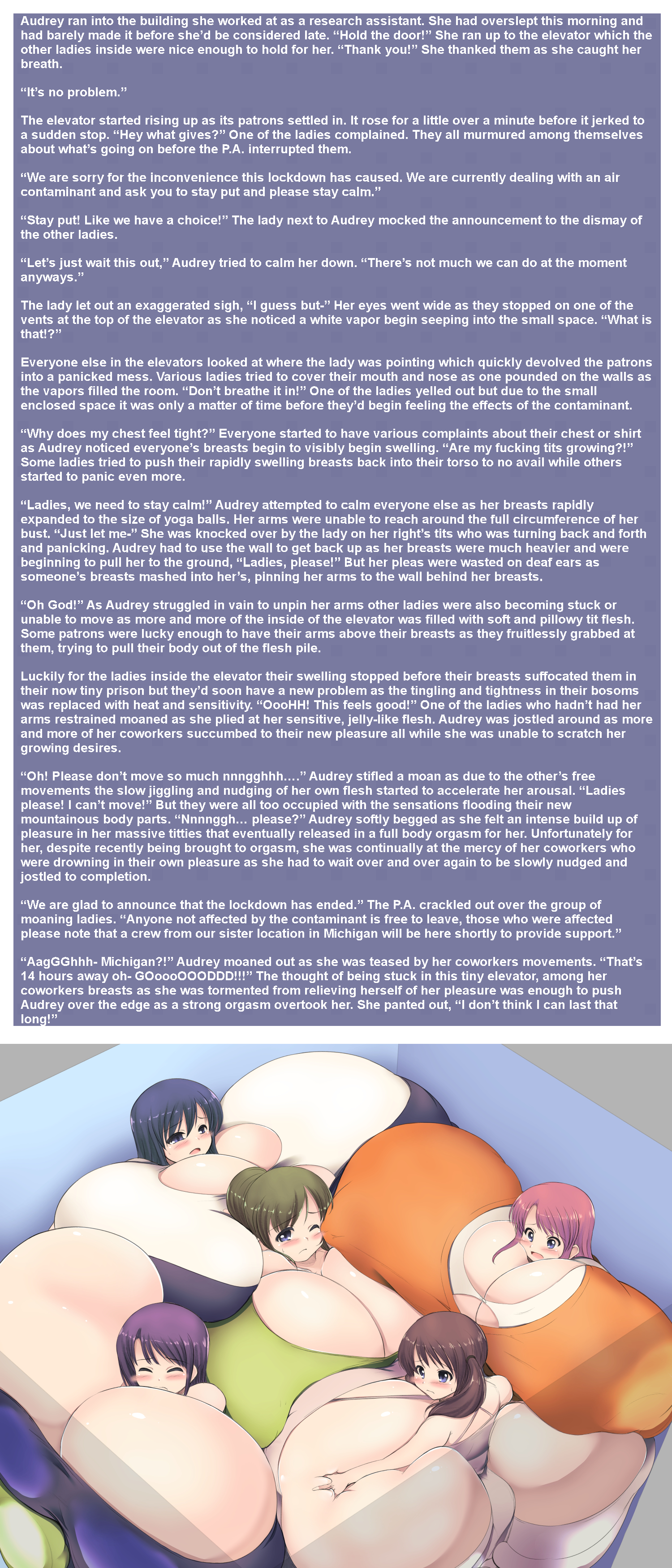 Luckily for the ladies inside the elevator their swelling stopped before their breasts suffocated them in their now tiny prison but they’d soon have a new problem as the tingling and tightness in their bosoms was replaced with heat and sensitivity. “OooHH! This feels good!” One of the ladies who hadn’t had her arms restrained moaned as she plied at her sensitive, jelly-like flesh. Audrey was jostled around as more and more of her coworkers succumbed to their new pleasure all while she was unable to scratch her growing desires.