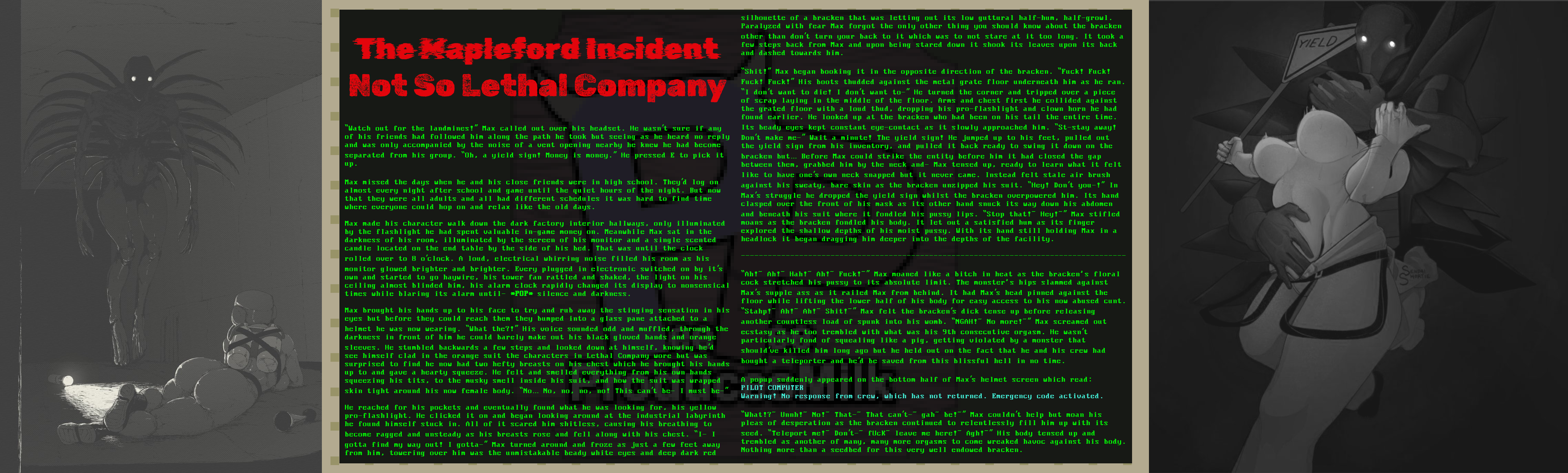“Shit!” Max began booking it in the opposite direction of the bracken. “Fuck! Fuck! Fuck! Fuck!” His boots thudded against the metal grate floor underneath him as he ran. “I don’t want to die! I don’t want to-” He turned the corner and tripped over a piece of scrap laying in the middle of the floor. Arms and chest first he collided against the grated floor with a loud thud, dropping his pro-flashlight and clown horn he had found earlier. He looked up at the bracken who had been on his tail the entire time. Its beady eyes kept constant eye-contact as it slowly approached him. “St-stay away! Don’t make me-” Wait a minute! The yield sign! He jumped up to his feet, pulled out the yield sign from his inventory, and pulled it back ready to swing it down on the bracken but… Before Max could strike the entity before him it had closed the gap between them, grabbed him by the neck and- Max tensed up, ready to learn what it felt like to have one’s own neck snapped but it never came. Instead felt stale air brush against his sweaty, bare skin as the bracken unzipped his suit. “Hey! Don’t you-!” In Max’s struggle he dropped the yield sign whilst the bracken overpowered him. Its hand clasped over the front of his mask as its other hand snuck its way down his abdomen and beneath his suit where it fondled his pussy lips. “Stop that!~ Hey!~” Max stifled moans as the bracken fondled his body. It let out a satisfied hum as its finger explored the shallow depths of his moist pussy. With its hand still holding Max in a headlock it began dragging him deeper into the depths of the facility.