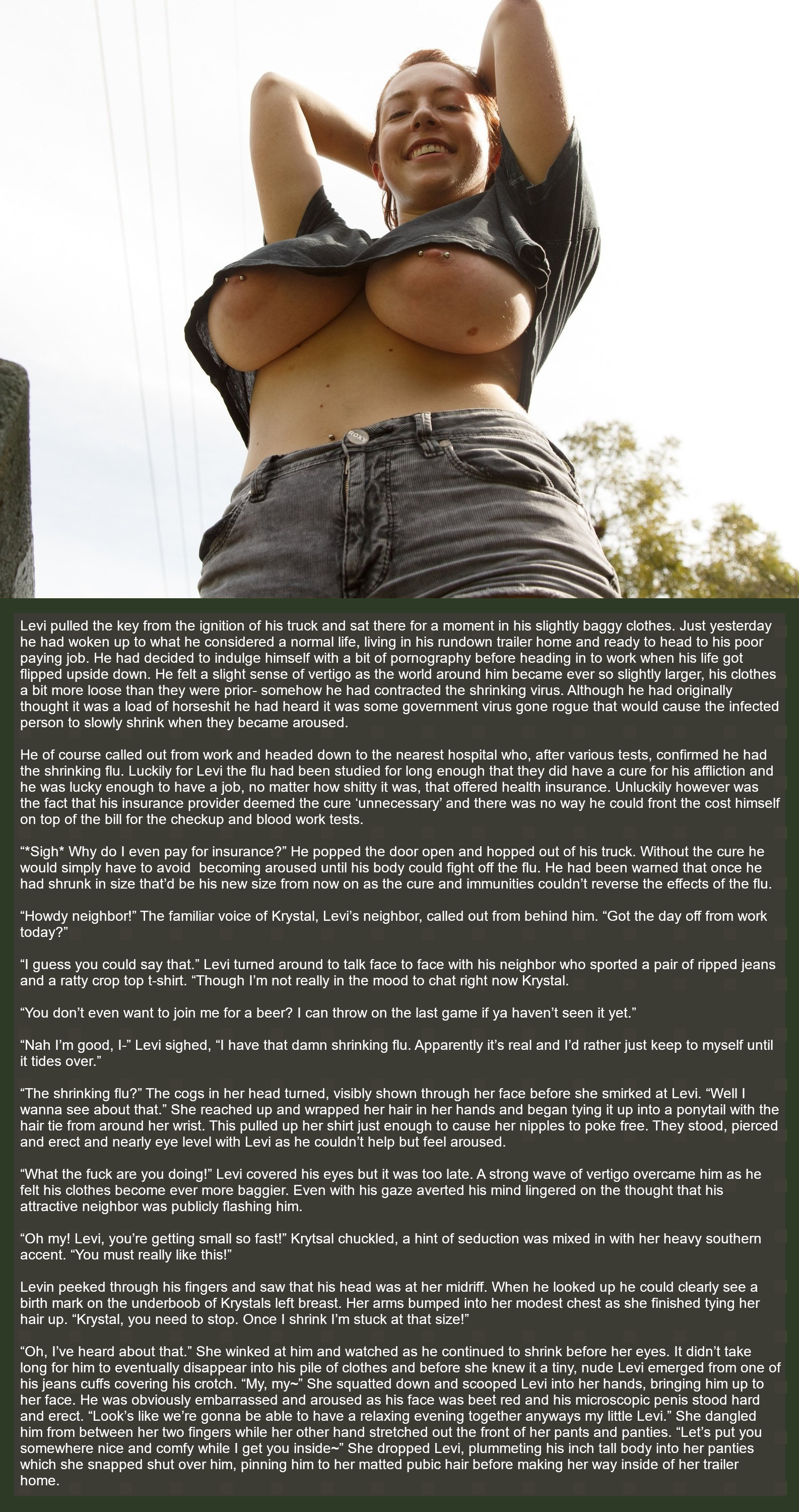 Levi pulled the key from the ignition of his truck and sat there for a moment in his slightly baggy clothes. Just yesterday he had woken up to what he considered a normal life, living in his rundown trailer home and ready to head to his poor paying job. He had decided to indulge himself with a bit of pornography before heading in to work when his life got flipped upside down. He felt a slight sense of vertigo as the world around him became ever so slightly larger, his clothes a bit more loose than they were prior- somehow he had contracted the shrinking virus. Although he had originally thought it was a load of horseshit he had heard it was some government virus gone rogue that would cause the infected person to slowly shrink when they became aroused.