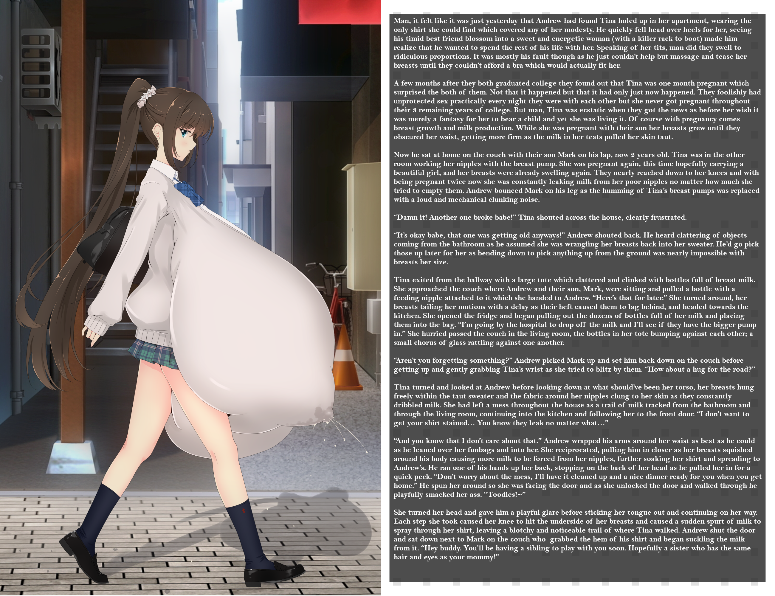 A few months after they both graduated college they found out that Tina was one month pregnant which surprised the both of them. Not that it happened but that it had only just now happened. They foolishly had unprotected sex practically every night they were with each other but she never got pregnant throughout their 3 remaining years of college. But man, Tina was ecstatic when they got the news as before her wish it was merely a fantasy for her to bear a child and yet she was living it. Of course with pregnancy comes breast growth and milk production. While she was pregnant with their son her breasts grew until they obscured her waist, getting more firm as the milk in her teats pulled her skin taut.