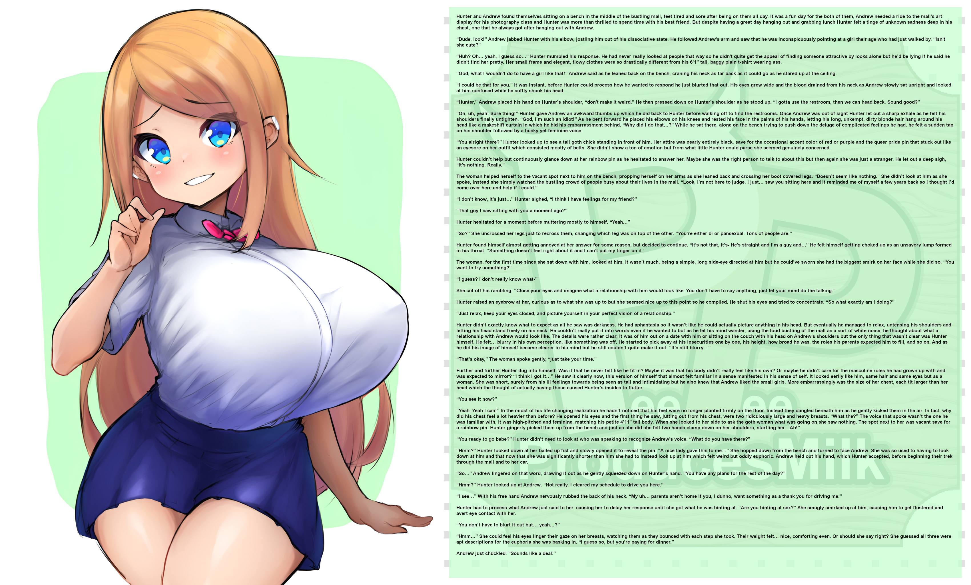 “Yeah. Yeah I can!” In the midst of his life changing realization he hadn’t noticed that his feet were no longer planted firmly on the floor. Instead they dangled beneath him as he gently kicked them in the air. In fact, why did his chest feel a lot heavier than before? He opened his eyes and the first thing he saw, jutting out from his chest, were two ridiculously large and heavy breasts. “What the?” The voice that spoke wasn’t the one he was familiar with, it was high-pitched and feminine, matching his petite 4’11” tall body. When she looked to her side to ask the goth woman what was going on she saw nothing. The spot next to her was vacant save for a rainbow pin. Hunter gingerly picked them up from the bench and just as she did she felt two hands clamp down on her shoulders, startling her. “Ah!”
