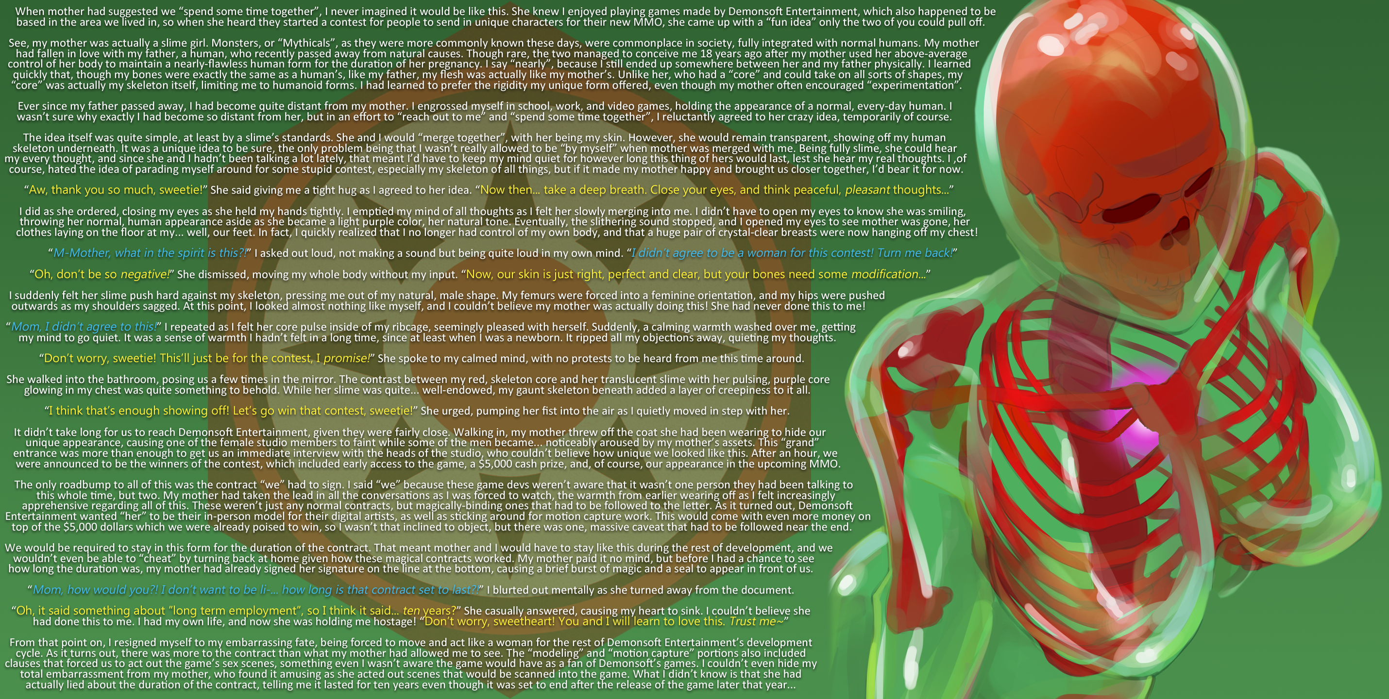 The idea itself was quite simple, at least by a slime’s standards. She and I would “merge together”, with her being my skin. However, she would remain transparent, showing off my human skeleton underneath. It was a unique idea to be sure, the only problem being that I wasn’t really allowed to be “by myself” when mother was merged with me. Being fully slime, she could hear my every thought, and since she and I hadn’t been talking a lot lately, that meant I’d have to keep my mind quiet for however long this thing of hers would last, lest she hear my real thoughts. I ,of course, hated the idea of parading myself around for some stupid contest, especially my skeleton of all things, but if it made my mother happy and brought us closer together, I’d bear it for now.
