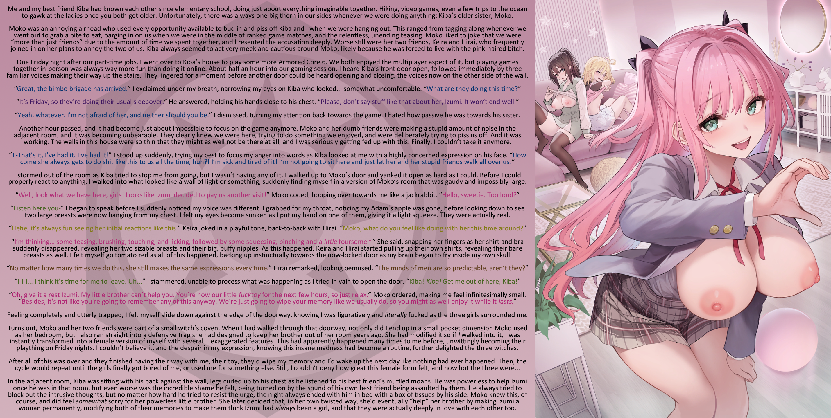 Turns out, Moko and her two friends were part of a small witch’s coven. When I had walked through that doorway, not only did I end up in a small pocket dimension Moko used as her bedroom, but I also ran straight into a defensive trap she had designed to keep her brother out of her room years ago. She had modified it so if I walked into it, I was instantly transformed into a female version of myself with several… exaggerated features. This had apparently happened many times to me before, unwittingly becoming their plaything on Friday nights. I couldn’t believe it, and the despair in my expression, knowing this insane madness had become a routine, further delighted the three witches.