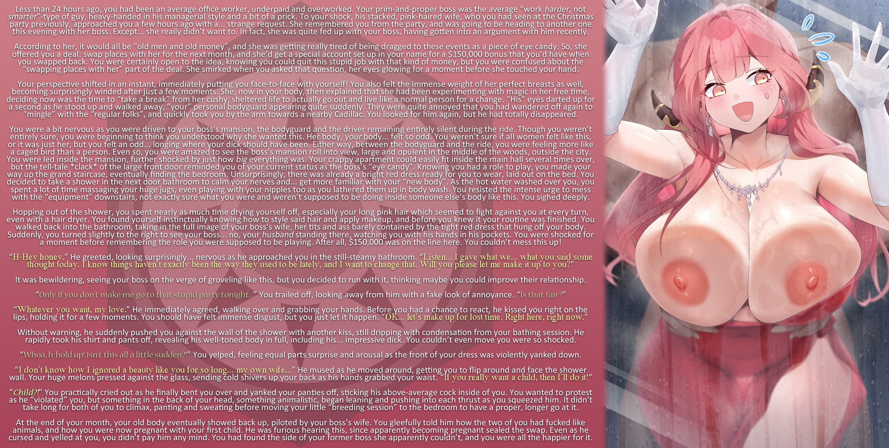 Hopping out of the shower, you spent nearly as much time drying yourself off, especially your long pink hair which seemed to fight against you at every turn, even with a hair dryer. You found yourself instinctually knowing how to style said hair and apply makeup, and before you knew it your routine was finished. You walked back into the bathroom, taking in the full image of your boss’s wife, her tits and ass barely contained by the tight red dress that hung off your body. Suddenly, you turned slightly to the right to see your boss… no, your husband standing there, watching you with his hands in his pockets. You were shocked for a moment before remembering the role you were supposed to be playing. After all, $150,000 was on the line here. You couldn’t mess this up!