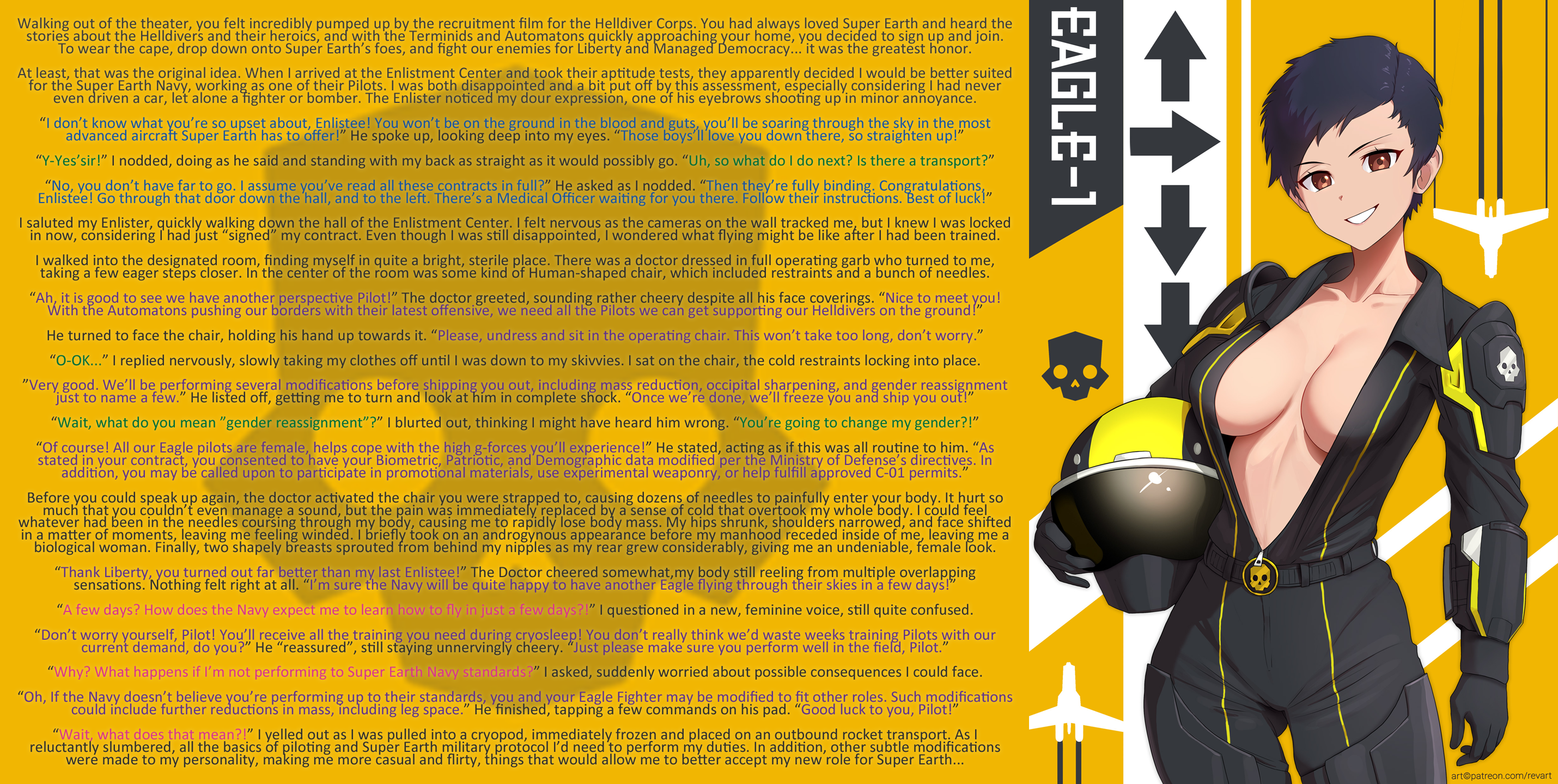“Of course! All our Eagle pilots are female, helps cope with the high g-forces you’ll experience!” He stated, acting as if this was all routine to him. “As stated in your contract, you consented to have your Biometric, Patriotic, and Demographic data modified per the Ministry of Defense’s directives. In addition, you may be called upon to participate in promotional materials, use experimental weaponry, or help fulfill approved C-01 permits.”