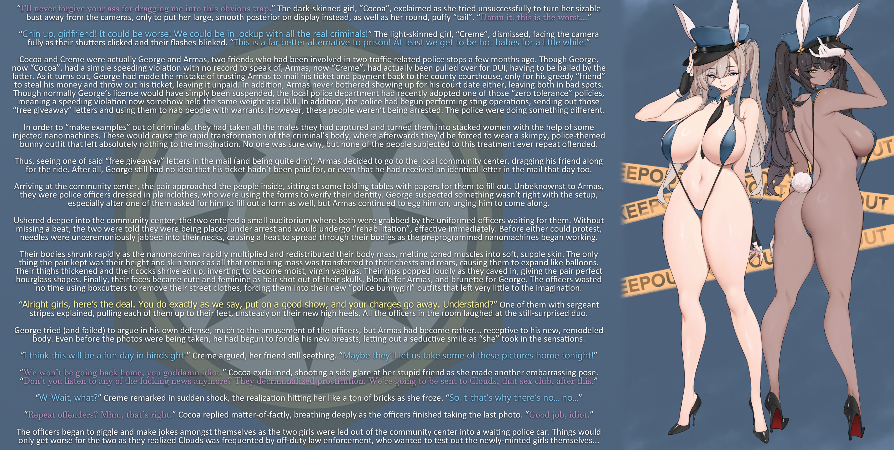 Their bodies shrunk rapidly as the nanomachines rapidly multiplied and redistributed their body mass, melting toned muscles into soft, supple skin. The only thing the pair kept was their height and skin tones as all that remaining mass was transferred to their chests and rears, causing them to expand like balloons. Their thighs thickened and their cocks shriveled up, inverting to become moist, virgin vaginas. Their hips popped loudly as they caved in, giving the pair perfect hourglass shapes. Finally, their faces became cute and feminine as hair shot out of their skulls, blonde for Armas, and brunette for George. The officers wasted no time using boxcutters to remove their street clothes, forcing them into their new “police bunnygirl” outfits that left very little to the imagination.