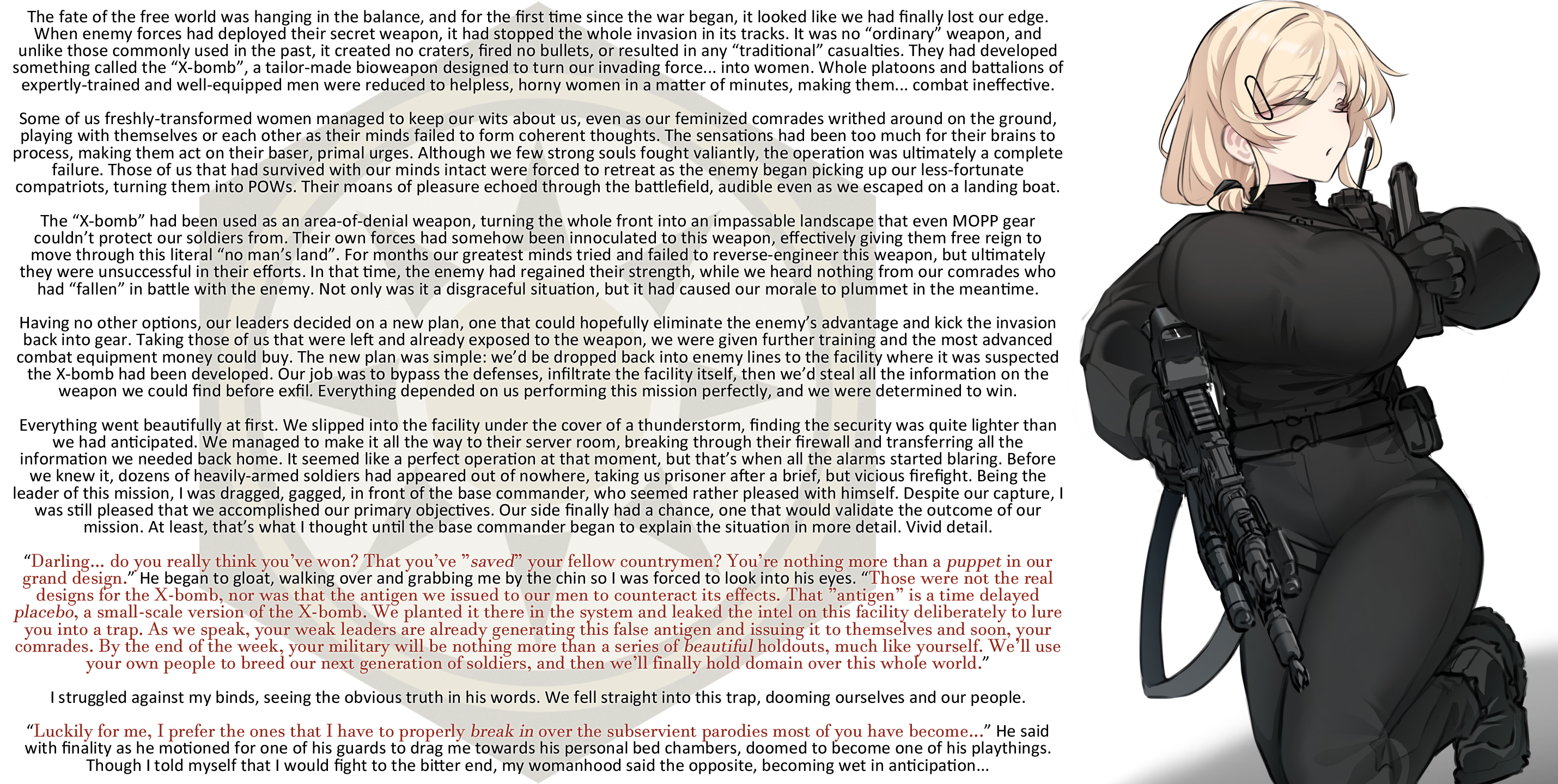 “Darling… do you really think you’ve won? That you’ve ”saved” your fellow countrymen? You’re nothing more than a puppet in our grand design.” He began to gloat, walking over and grabbing me by the chin so I was forced to look into his eyes. “Those were not the real designs for the X-bomb, nor was that the antigen we issued to our men to counteract its effects. That ”antigen” is a time-delayed placebo, a small-scale version of the X-bomb. We planted it there in the system and leaked the intel on this facility deliberately to lure you into a trap. As we speak, your weak leaders are already generating this false antigen and issuing it to themselves and soon, your comrades. By the end of the week, your military will be nothing more than a series of beautiful holdouts, much like yourself. We’ll use your own people to breed our next generation of soldiers, and then we’ll finally hold domain over this whole world.”