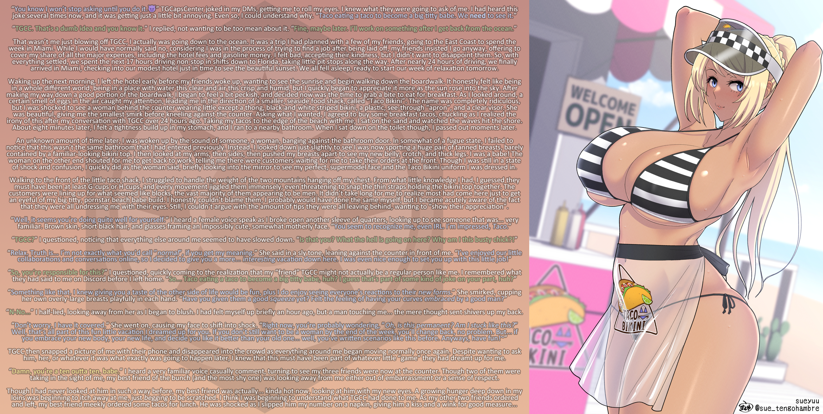 An unknown amount of time later, I was woken up by the sound of someone, a woman, banging against the bathroom door. In somewhat of a fugue state, I failed to notice that this wasn’t the same bathroom that I had entered previously. Instead, I looked down just slightly to see I was now sporting a huge pair of tanned breasts, barely contained by a familiar-looking bikini top. I then looked at my arms, then sides, then pushed my breasts apart to see my new belly, crotch, and thick legs. I was a babe! The woman on the other end shouted for me to get back to work, telling me there were customers waiting for me to take their orders at the front. Though I was still in a state of shock and confusion, I quickly did as the woman said, briefly looking into the mirror to see my perfect, supermodel face and the Taco Bikini uniform I was dressed in.