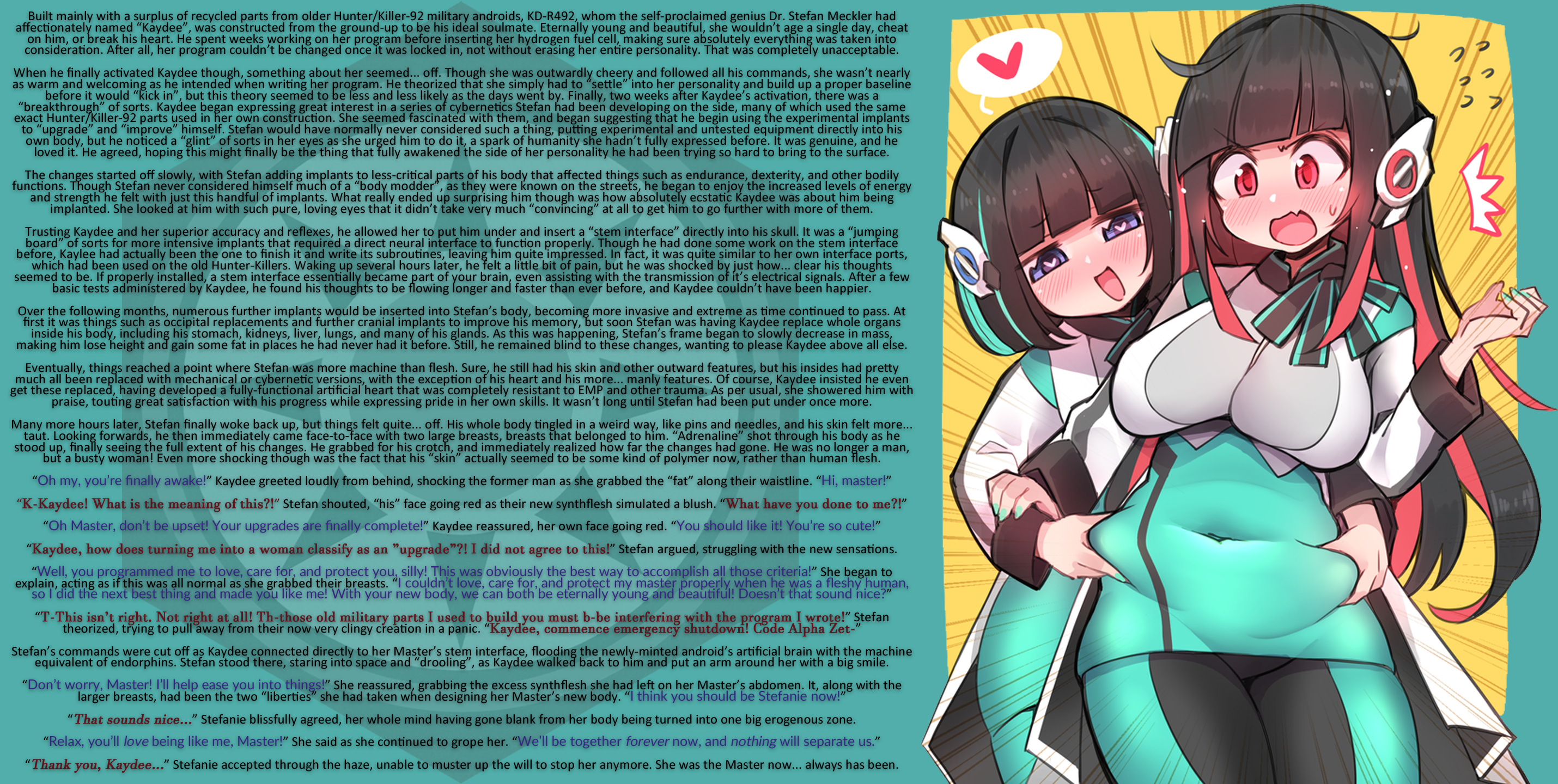 “Well, you programmed me to love, care for, and protect you, silly! This was obviously the best way to accomplish all those criteria!” She began to explain, acting as if this was all normal as she grabbed their breasts. “I couldn’t love, care for, and protect my master properly when he was a fleshy human, so I did the next best thing and made you like me! With your new body, we can both be eternally young and beautiful! Doesn’t that sound nice?”