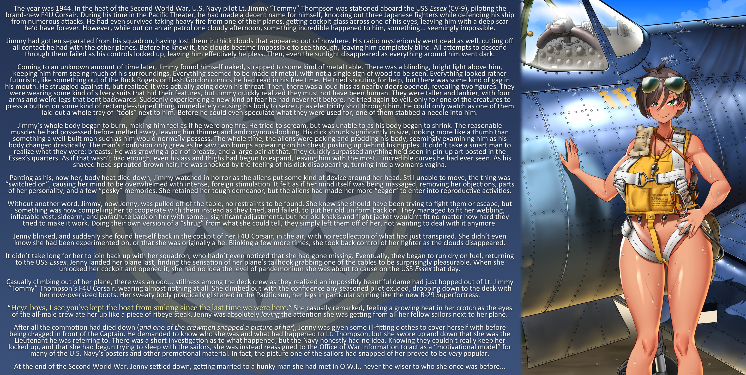 Without another word, Jimmy, now Jenny, was pulled off of the table, no restraints to be found. She knew she should have been trying to fight them or escape, but something was now compelling her to cooperate with them instead as they tried, and failed, to put her old uniform back on. They managed to fit her webbing, inflatable vest, sidearm, and parachute back on her with some… significant adjustments, but her old khakis and flight jacket wouldn’t fit no matter how hard they tried to make it work. Doing their own version of a “shrug” from what she could tell, they simply left them off of her, not wanting to deal with it anymore.