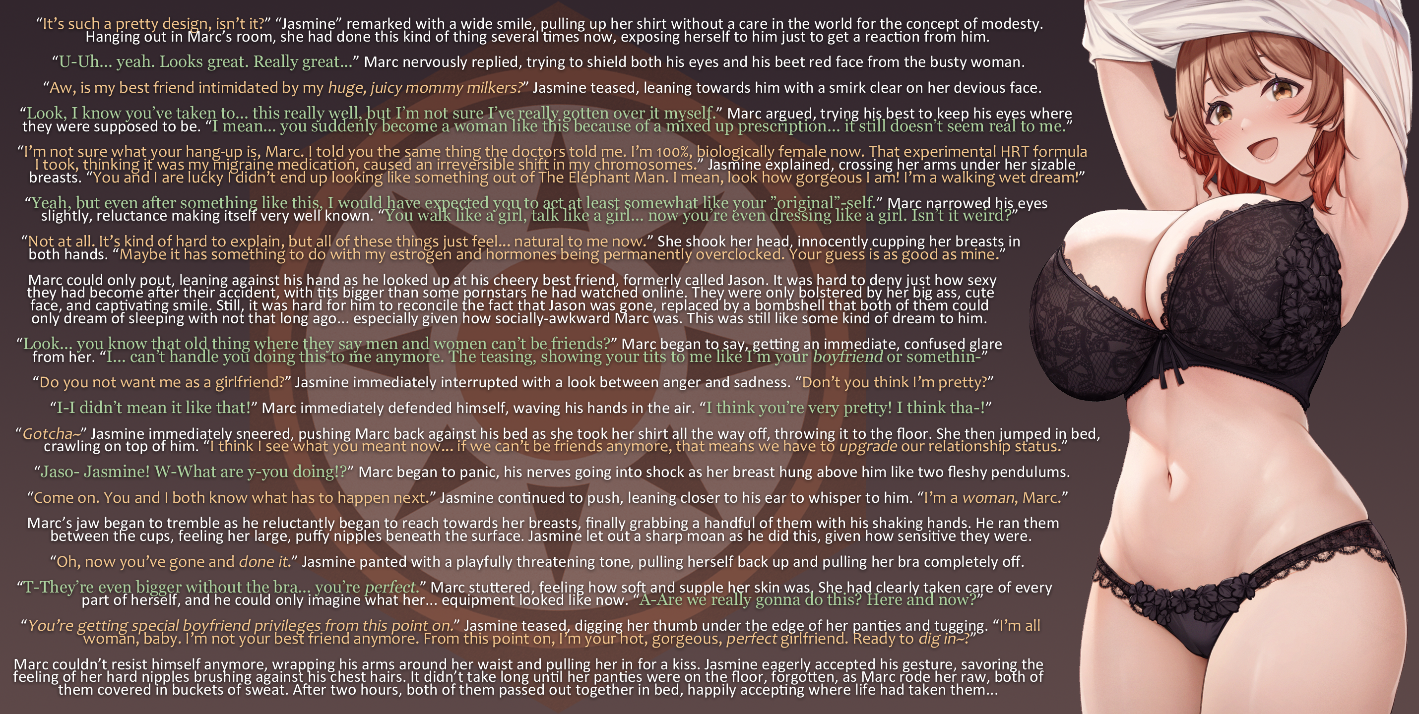 Marc could only pout, leaning against his hand as he looked up at his cheery best friend, formerly called Jason. It was hard to deny just how sexy they had become after their accident, with tits bigger than some pornstars he had watched online. They were only bolstered by her big ass, cute face, and captivating smile. Still, it was hard for him to reconcile the fact that Jason was gone, replaced by a bombshell that both of them could only dream of sleeping with not that long ago… especially given how socially-awkward Marc was. This was still like some kind of dream to him.