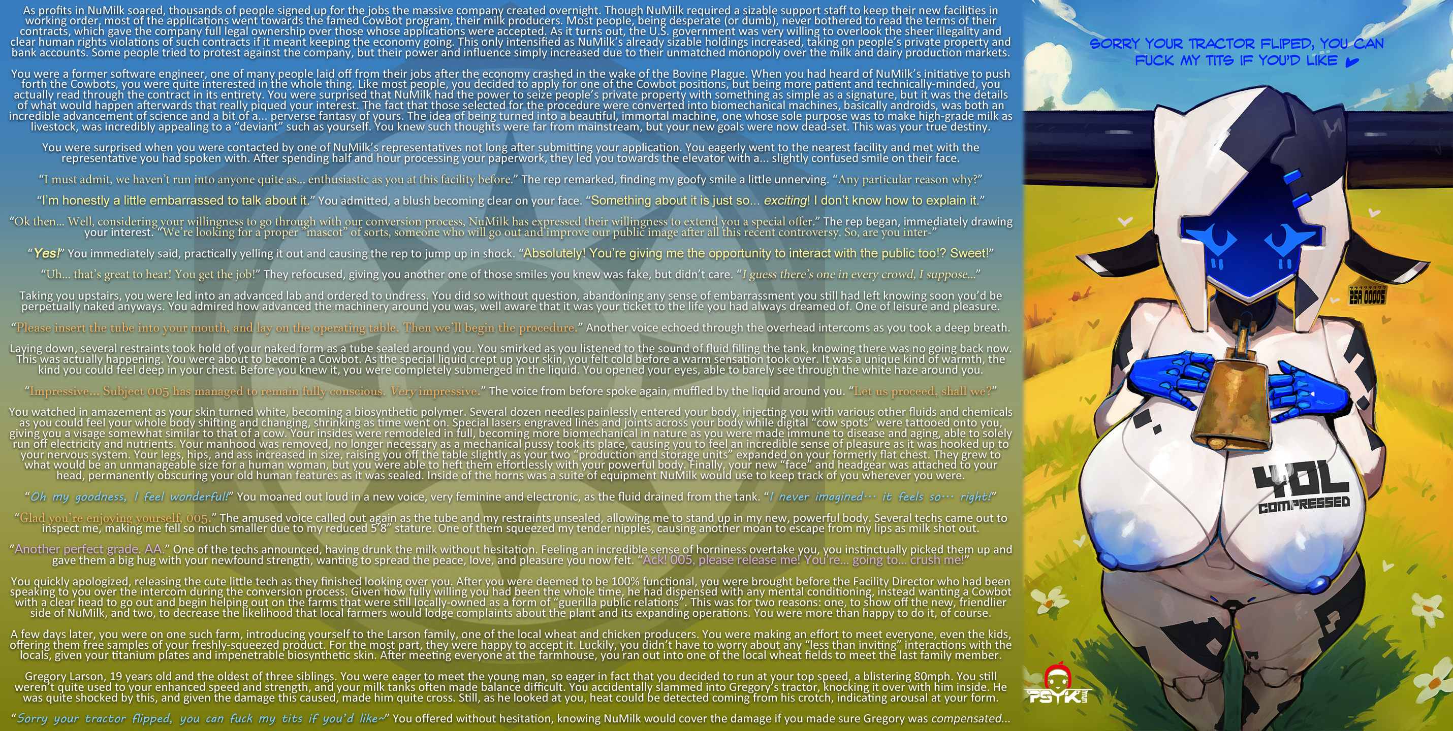 You were a former software engineer, one of many people laid off from their jobs after the economy crashed in the wake of the Bovine Plague. When you had heard of NuMilk’s initiative to push forth the Cowbots, you were quite interested in the whole thing. Like most people, you decided to apply for one of the Cowbot positions, but being more patient and technically-minded, you actually read through the contract in its entirety. You were surprised that NuMilk had the power to seize people’s private property with something as simple as a signature, but it was the details of what would happen afterwards that really piqued your interest. The fact that those selected for the procedure were converted into biomechanical machines, basically androids, was both an incredible advancement of science and a bit of a… perverse fantasy of yours. The idea of being turned into a beautiful, immortal machine, one whose sole purpose was to make high-grade milk as livestock, was incredibly appealing to a “deviant” such as yourself. You knew such thoughts were far from mainstream, but your new goals were now dead-set. This was your true destiny.