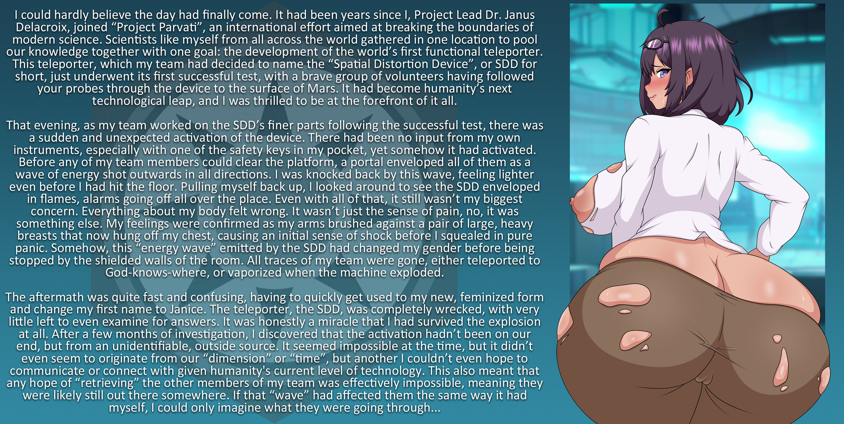 That evening, as my team worked on the SDD’s finer parts following the successful test, there was a sudden and unexpected activation of the device. There had been no input from my own instruments, especially with one of the safety keys in my pocket, yet somehow it had activated. Before any of my team members could clear the platform, a portal enveloped all of them as a wave of energy shot outwards in all directions. I was knocked back by this wave, feeling lighter even before I had hit the floor. Pulling myself back up, I looked around to see the SDD enveloped in flames, alarms going off all over the place. Even with all of that, it still wasn’t my biggest concern. Everything about my body felt wrong. It wasn’t just the sense of pain, no, it was something else. My feelings were confirmed as my arms brushed against a pair of large, heavy breasts that now hung off my chest, causing an initial sense of shock before I squealed in pure panic. Somehow, this “energy wave” emitted by the SDD had changed my gender before being stopped by the shielded walls of the room. All traces of my team were gone, either teleported to God-knows-where, or vaporized when the machine exploded.