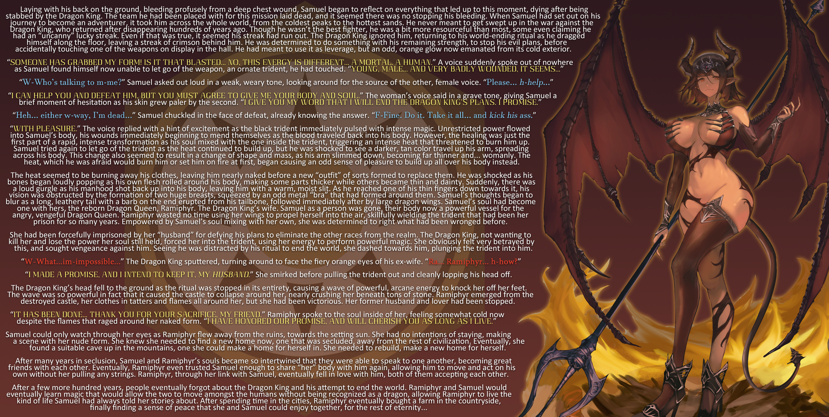 The heat seemed to be burning away his clothes, leaving him nearly naked before a new “outfit” of sorts formed to replace them. He was shocked as his bones began loudly popping as his own flesh rolled around his body, making some parts thicker while others became thin and dainty. Suddenly, there was a loud gurgle as his manhood shot back up into his body, leaving him with a warm, moist slit. As he reached one of his thin fingers down towards it, his vision was obstructed by the formation of two huge breasts, squeezed by an odd metal “bra” that had formed around them. Samuel’s thoughts began to blur as a long, leathery tail with a barb on the end erupted from his tailbone, followed immediately after by large dragon wings. Samuel’s soul had become one with hers, the reborn Dragon Queen, Ramiphyr. The Dragon King’s wife. Samuel as a person was gone, their body now a powerful vessel for the angry, vengeful Dragon Queen. Ramiphyr wasted no time using her wings to propel herself into the air, skillfully wielding the trident that had been her prison for so many years. Empowered by Samuel’s soul mixing with her own, she was determined to right what had been wronged before.