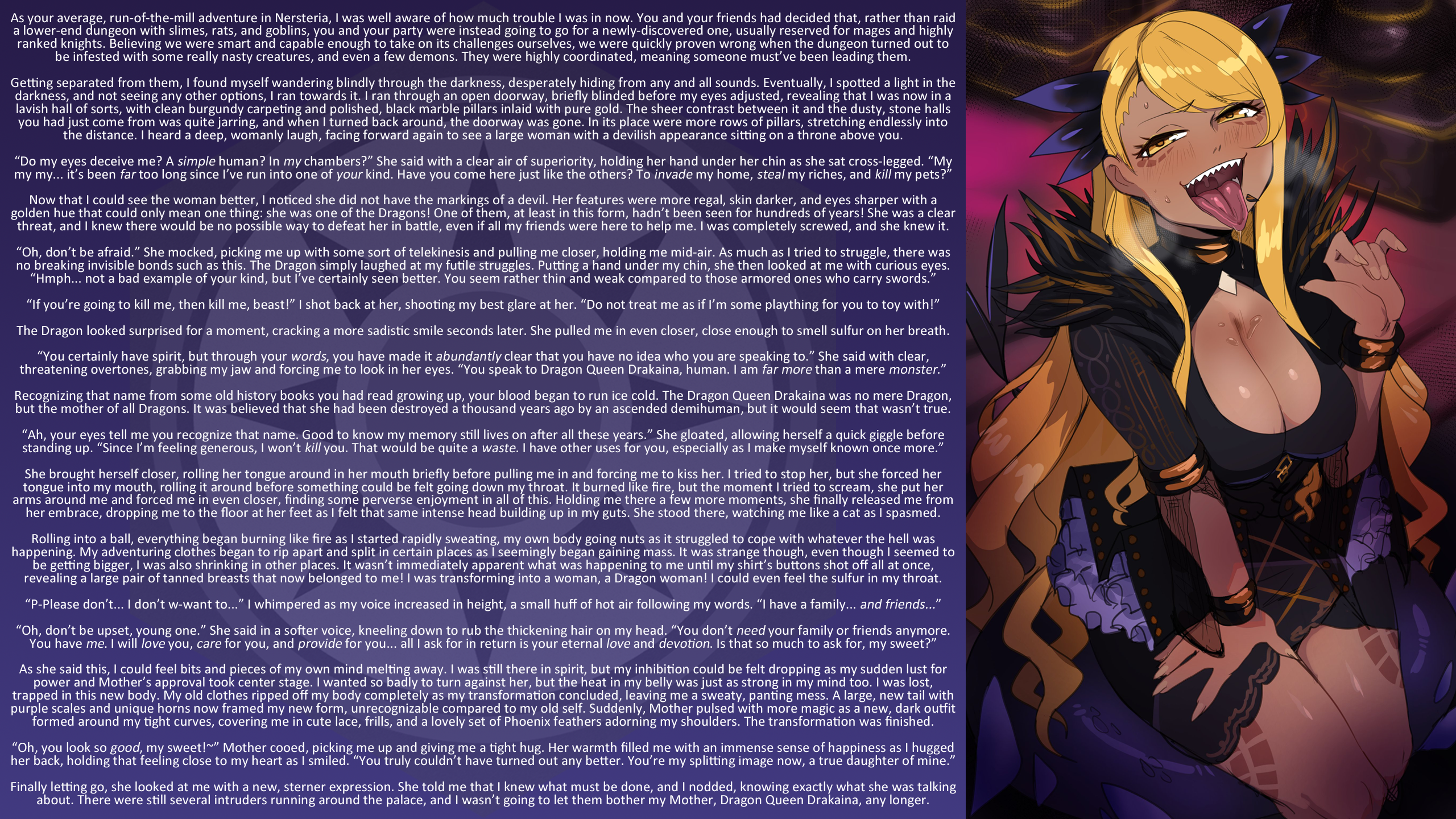 As she said this, I could feel bits and pieces of my own mind melting away. I was still there in spirit, but my inhibition could be felt dropping as my sudden lust for power and Mother’s approval took center stage. I wanted so badly to turn against her, but the heat in my belly was just as strong in my mind too. I was lost, trapped in this new body. My old clothes ripped off my body completely as my transformation concluded, leaving me a sweaty, panting mess. A large, new tail with purple scales and unique horns now framed my new form, unrecognizable compared to my old self. Suddenly, Mother pulsed with more magic as a new, dark outfit formed around my tight curves, covering me in cute lace, frills, and a lovely set of Phoenix feathers adorning my shoulders. The transformation was finished.
