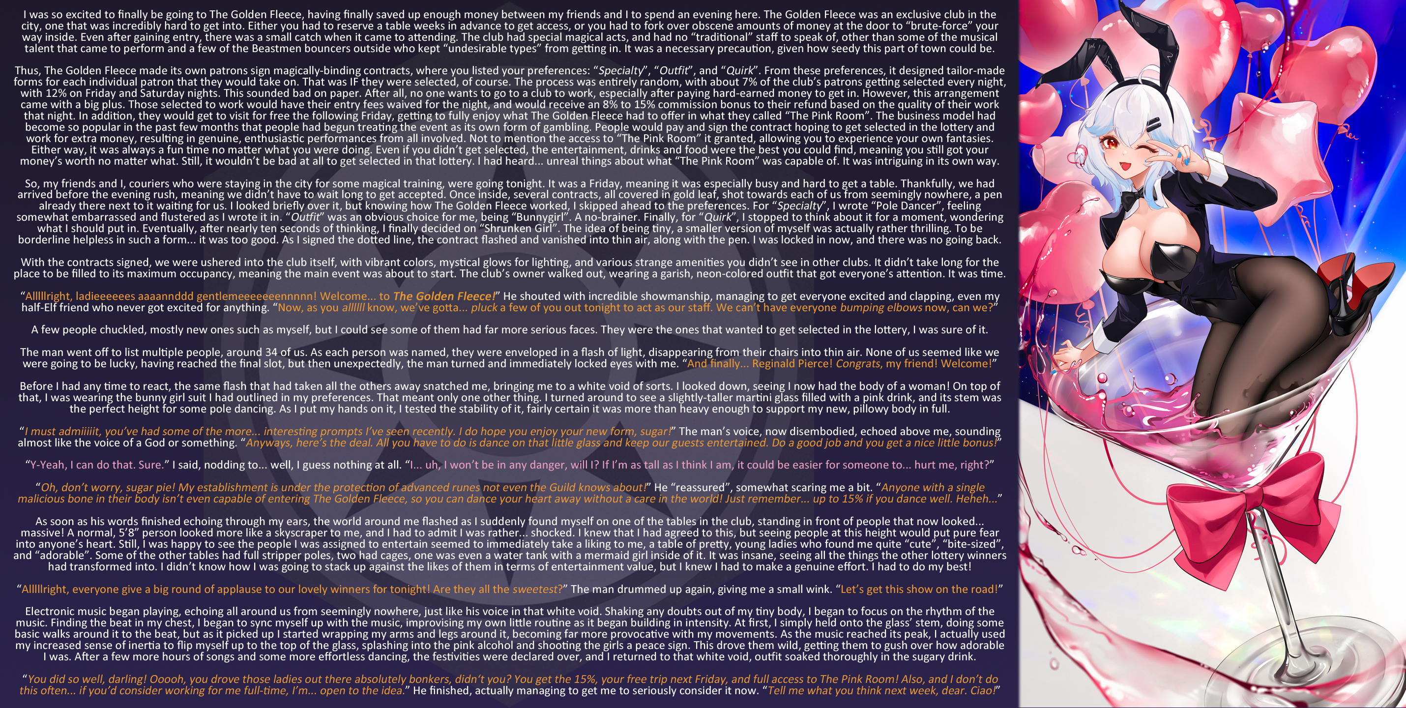 So, my friends and I, couriers who were staying in the city for some magical training, were going tonight. It was a Friday, meaning it was especially busy and hard to get a table. Thankfully, we had arrived before the evening rush, meaning we didn’t have to wait long to get accepted. Once inside, several contracts, all covered in gold leaf, shot towards each of us from seemingly nowhere, a pen already there next to it waiting for us. I looked briefly over it, but knowing how The Golden Fleece worked, I skipped ahead to the preferences. For “Specialty”, I wrote “Pole Dancer”, feeling somewhat embarrassed and flustered as I wrote it in. “Outfit” was an obvious choice for me, being “Bunnygirl”. A no-brainer. Finally, for “Quirk”, I stopped to think about it for a moment, wondering what I should put in. Eventually, after nearly ten seconds of thinking, I finally decided on “Shrunken Girl”. The idea of being tiny, a smaller version of myself was actually rather thrilling. To be borderline helpless in such a form… it was too good. As I signed the dotted line, the contract flashed and vanished into thin air, along with the pen. I was locked in now, and there was no going back.