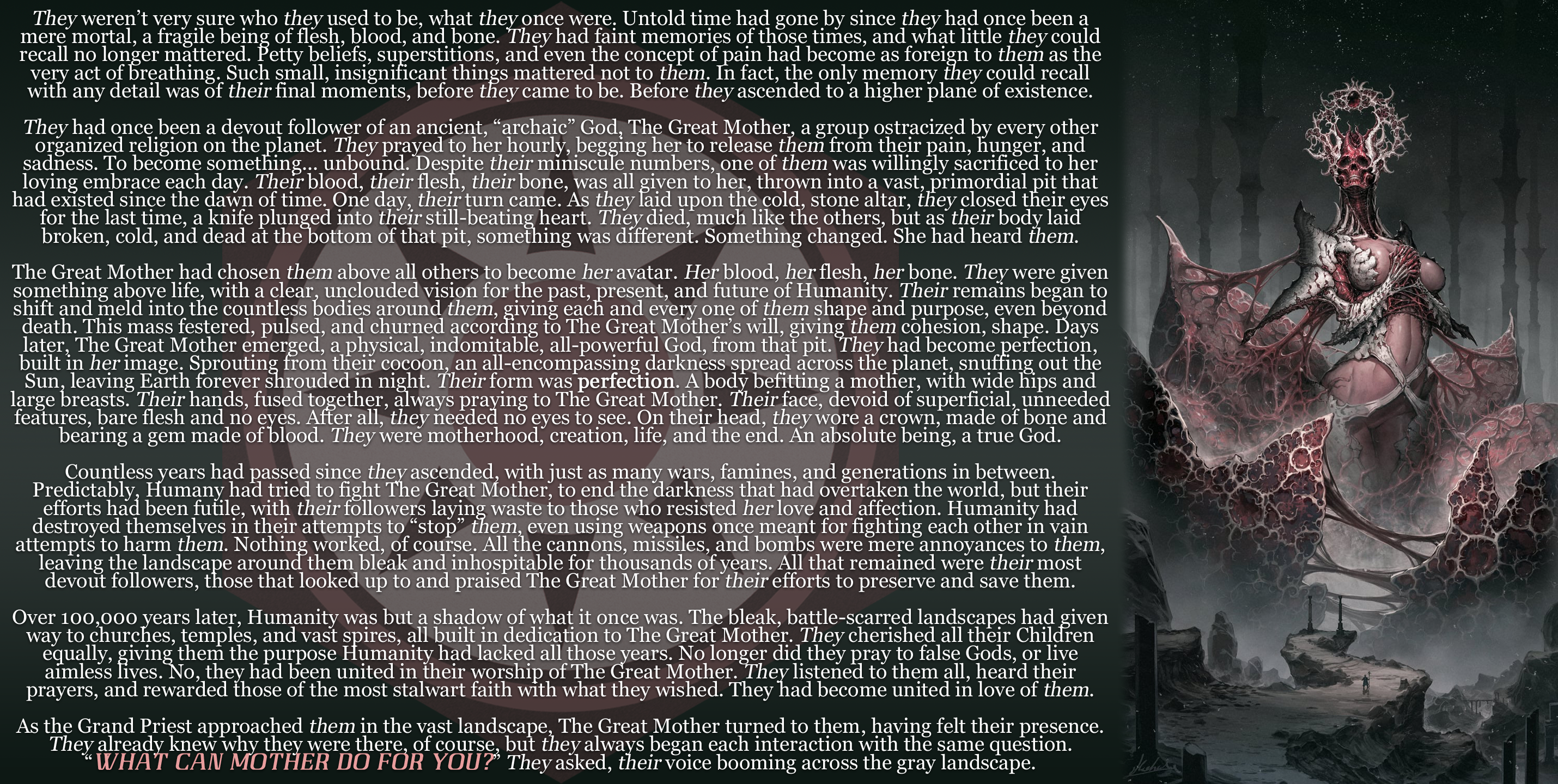 They had once been a devout follower of an ancient, “archaic” God, The Great Mother, a group ostracized by every other organized religion on the planet. They prayed to her hourly, begging her to release them from their pain, hunger, and sadness. To become something… unbound. Despite their miniscule numbers, one of them was willingly sacrificed to her loving embrace each day. Their blood, their flesh, their bone, was all given to her, thrown into a vast, primordial pit that had existed since the dawn of time. One day, their turn came. As they laid upon the cold, stone altar, they closed their eyes for the last time, a knife plunged into their still-beating heart. They died, much like the others, but as their body laid broken, cold, and dead at the bottom of that pit, something was different. Something changed. She had heard them.