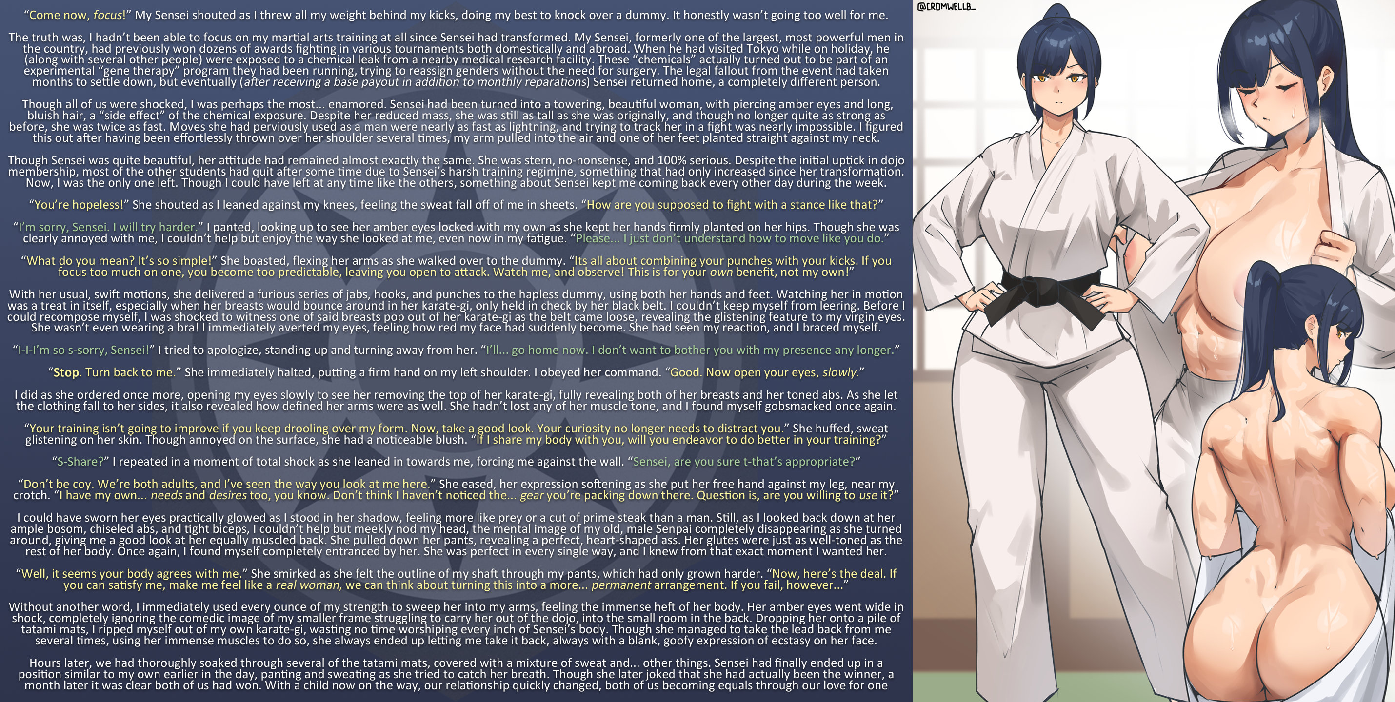 Though all of us were shocked, I was perhaps the most… enamored. Sensei had been turned into a towering, beautiful woman, with piercing amber eyes and long, bluish hair, a “side effect” of the chemical exposure. Despite her reduced mass, she was still as tall as she was originally, and though no longer quite as strong as before, she was twice as fast. Moves she had perviously used as a man were nearly as fast as lightning, and trying to track her in a fight was nearly impossible. I figured this out after having been effortlessly thrown over her shoulder several times, my arm pulled into the air and one of her feet planted straight against my neck.