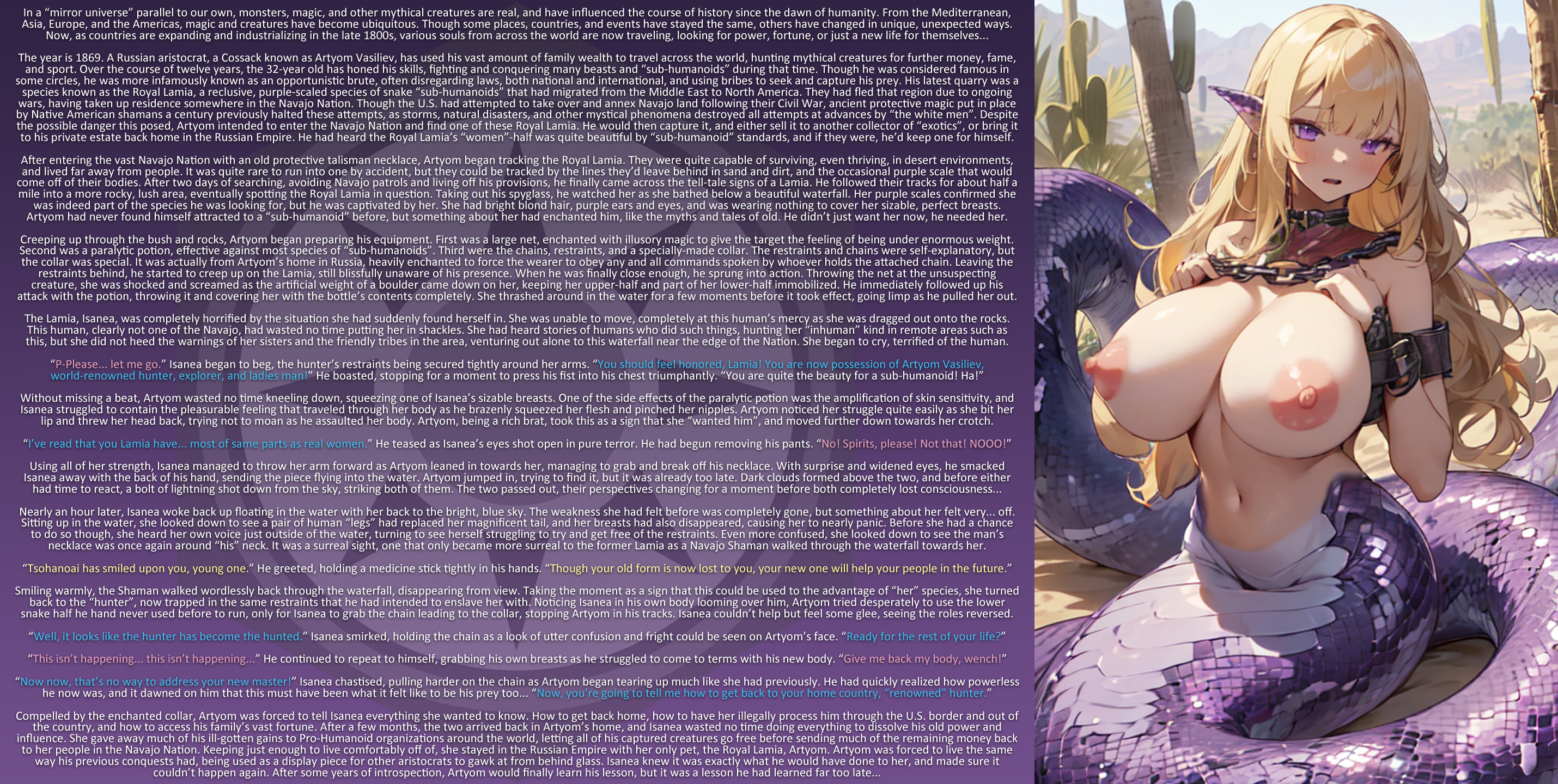 The year is 1869. A Russian aristocrat, a Cossack known as Artyom Vasiliev, has used his vast amount of family wealth to travel across the world, hunting mythical creatures for further money, fame, and sport. Over the course of twelve years, the 32-year old has honed his skills, fighting and conquering many beasts and “sub-humanoids” during that time. Though he was considered famous in some circles, he was more infamously known as an opportunistic brute, often disregarding laws, both national and international, and using bribes to seek and capture his prey. His latest quarry was a species known as the Royal Lamia, a reclusive, purple-scaled species of snake “sub-humanoids” that had migrated from the Middle East to North America. They had fled that region due to ongoing wars, having taken up residence somewhere in the Navajo Nation. Though the U.S. had attempted to take over and annex Navajo land following their Civil War, ancient protective magic put in place by Native American shamans a century previously halted these attempts, as storms, natural disasters, and other mystical phenomena destroyed all attempts at advances by “the white men”. Despite the possible danger this posed, Artyom intended to enter the Navajo Nation and find one of these Royal Lamia. He would then capture it, and either sell it to another collector of “exotics”, or bring it to his private estate back home in the Russian Empire. He had heard the Royal Lamia’s “women”-half was quite beautiful by “sub-humanoid” standards, and if they were, he’d keep one for himself.