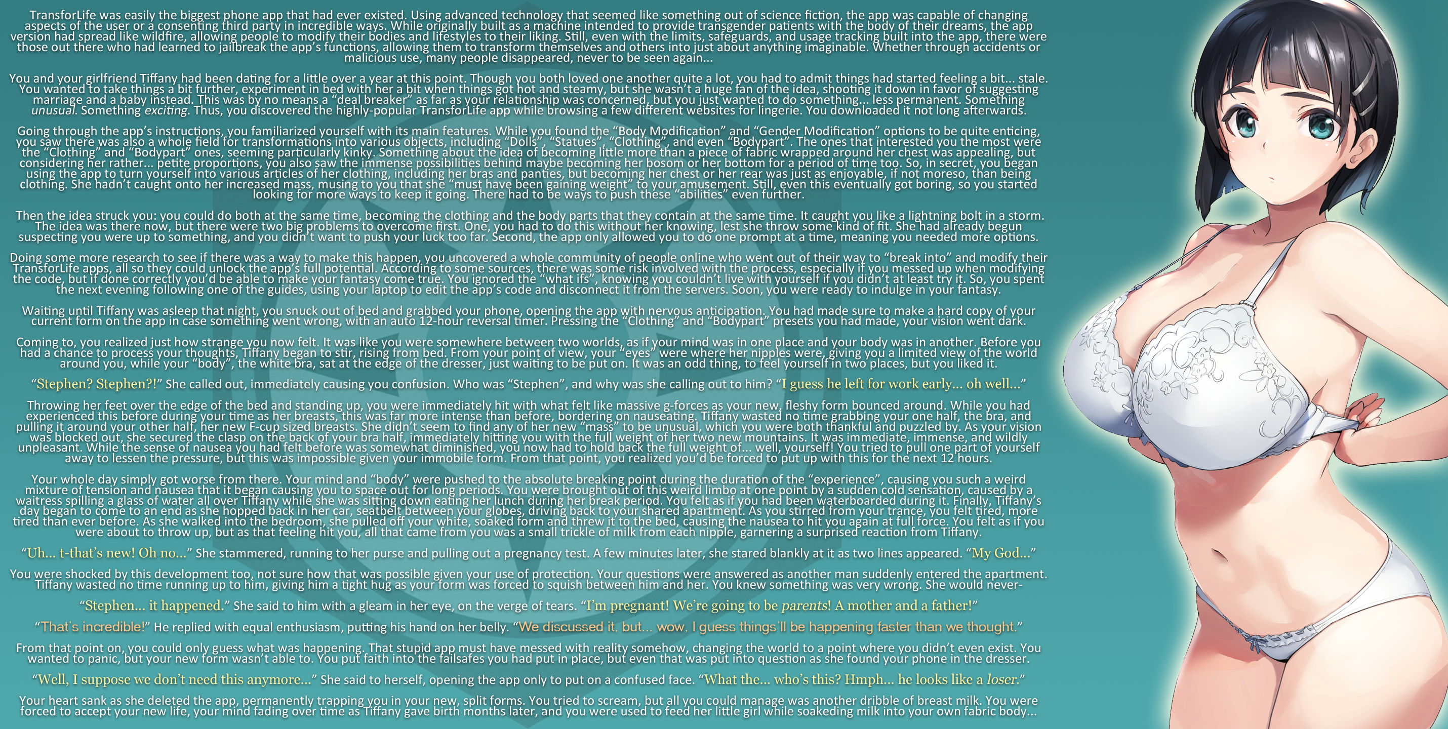 Going through the app’s instructions, you familiarized yourself with its main features. While you found the “Body Modification” and “Gender Modification” options to be quite enticing, you saw there was also a whole field for transformations into various objects, including “Dolls”, “Statues”, “Clothing”, and even “Bodypart”. The ones that interested you the most were the “Clothing” and “Bodypart” ones, seeming particularly kinky. Something about the idea of becoming little more than a piece of fabric wrapped around her chest was appealing, but considering her rather… petite proportions, you also saw the immense possibilities behind maybe becoming her bosom or her bottom for a period of time too. So, in secret, you began using the app to turn yourself into various articles of her clothing, including her bras and panties, but becoming her chest or her rear was just as enjoyable, if not moreso, than being clothing. She hadn’t caught onto her increased mass, musing to you that she “must have been gaining weight” to your amusement. Still, even this eventually got boring, so you started looking for more ways to keep it going. There had to be ways to push these “abilities” even further.