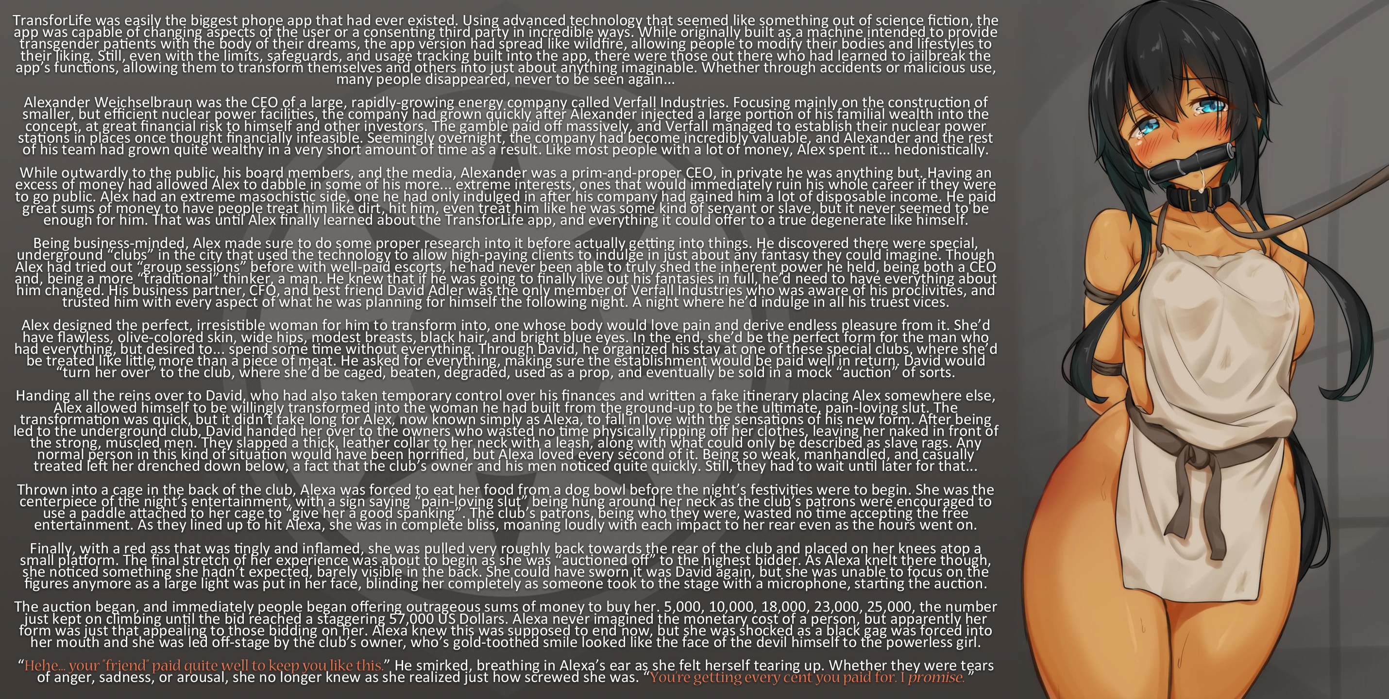 Handing all the reins over to David, who had also taken temporary control over his finances and written a fake itinerary placing Alex somewhere else, Alex allowed himself to be willingly transformed into the woman he had built from the ground-up to be the ultimate, pain-loving slut. The transformation was quick, but it didn’t take long for Alex, now known simply as Alexa, to fall in love with the sensations of his new form. After being led to the underground club, David handed her over to the owners who wasted no time physically ripping off her clothes, leaving her naked in front of the strong, muscled men. They slapped a thick, leather collar to her neck with a leash, along with what could only be described as slave rags. Any normal person in this kind of situation would have been horrified, but Alexa loved every second of it. Being so weak, manhandled, and casually treated left her drenched down below, a fact that the club’s owner and his men noticed quite quickly. Still, they had to wait until later for that…