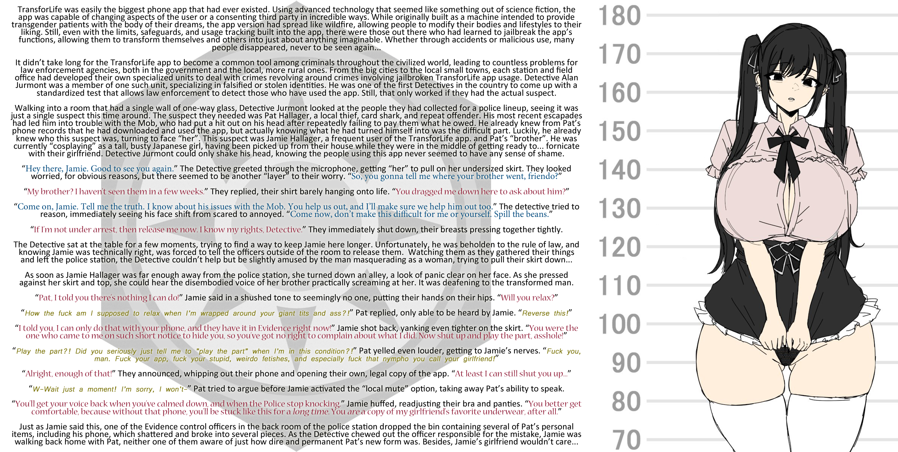 Walking into a room that had a single wall of one-way glass, Detective Jurmont looked at the people they had collected for a police lineup, seeing it was just a single suspect this time around. The suspect they needed was Pat Hallager, a local thief, card shark, and repeat offender. His most recent escapades had led him into trouble with the Mob, who had put a hit out on his head after repeatedly failing to pay them what he owed. He already knew from Pat’s phone records that he had downloaded and used the app, but actually knowing what he had turned himself into was the difficult part. Luckily, he already knew who this suspect was, turning to face “her”. This suspect was Jamie Hallager, a frequent user of the TransforLife app. and Pat’s “brother”. He was currently “cosplaying” as a tall, busty Japanese girl, having been picked up from their house while they were in the middle of getting ready to… fornicate with their girlfriend. Detective Jurmont could only shake his head, knowing the people using this app never seemed to have any sense of shame.