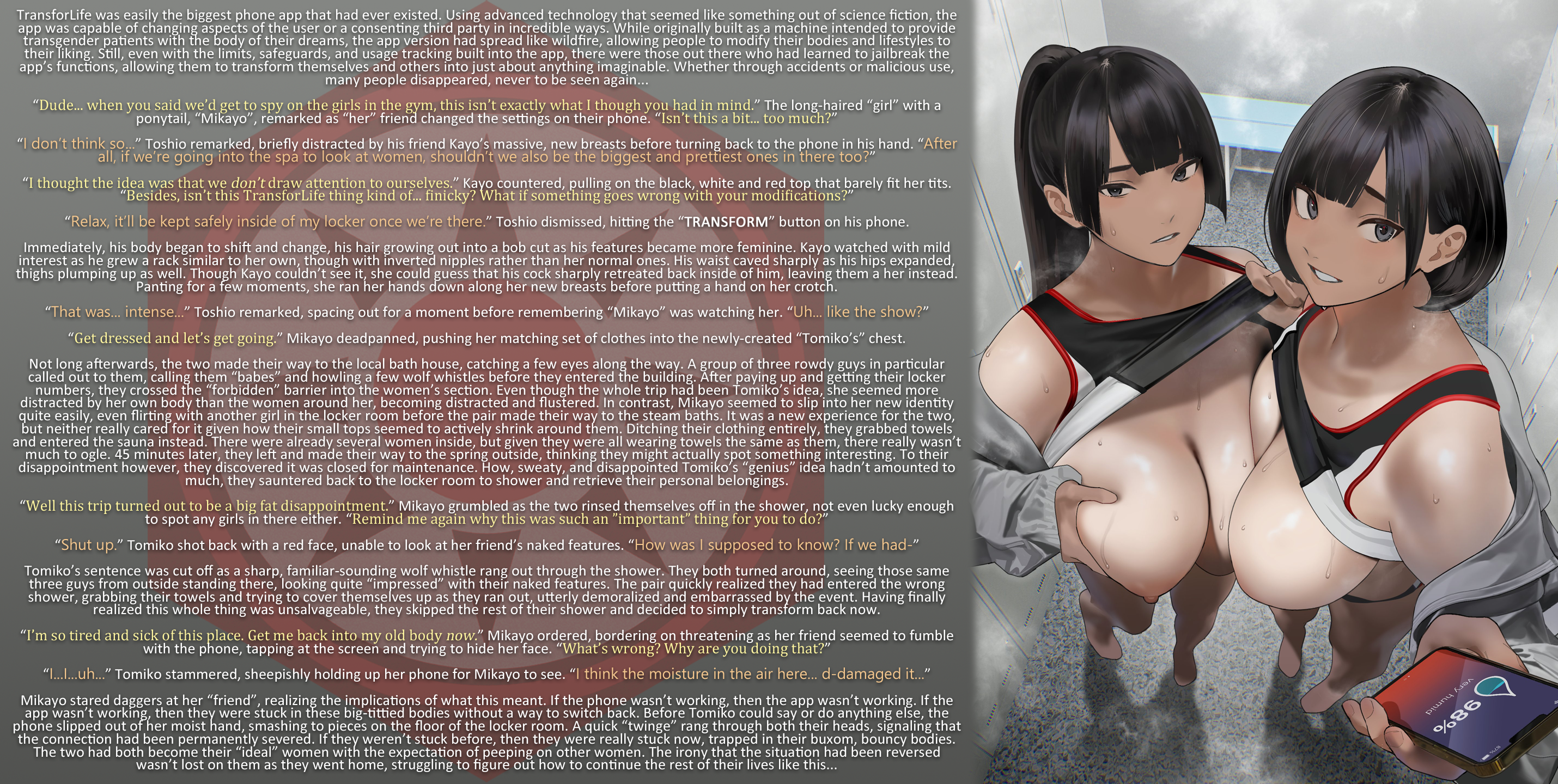 Mikayo stared daggers at her “friend”, realizing the implications of what this meant. If the phone wasn’t working, then the app wasn’t working. If the app wasn’t working, then they were stuck in these big-tittied bodies without a way to switch back. Before Tomiko could say or do anything else, the phone slipped out of her moist hand, smashing to pieces on the floor of the locker room. A quick “twinge” rang through both their heads, signaling that the connection had been permanently severed. If they weren’t stuck before, then they were really stuck now, trapped in their buxom, bouncy bodies. The two had both become their “ideal” women with the expectation of peeping on other women. The irony that the situation had been reversed wasn’t lost on them as they went home, struggling to figure out how to continue the rest of their lives like this…