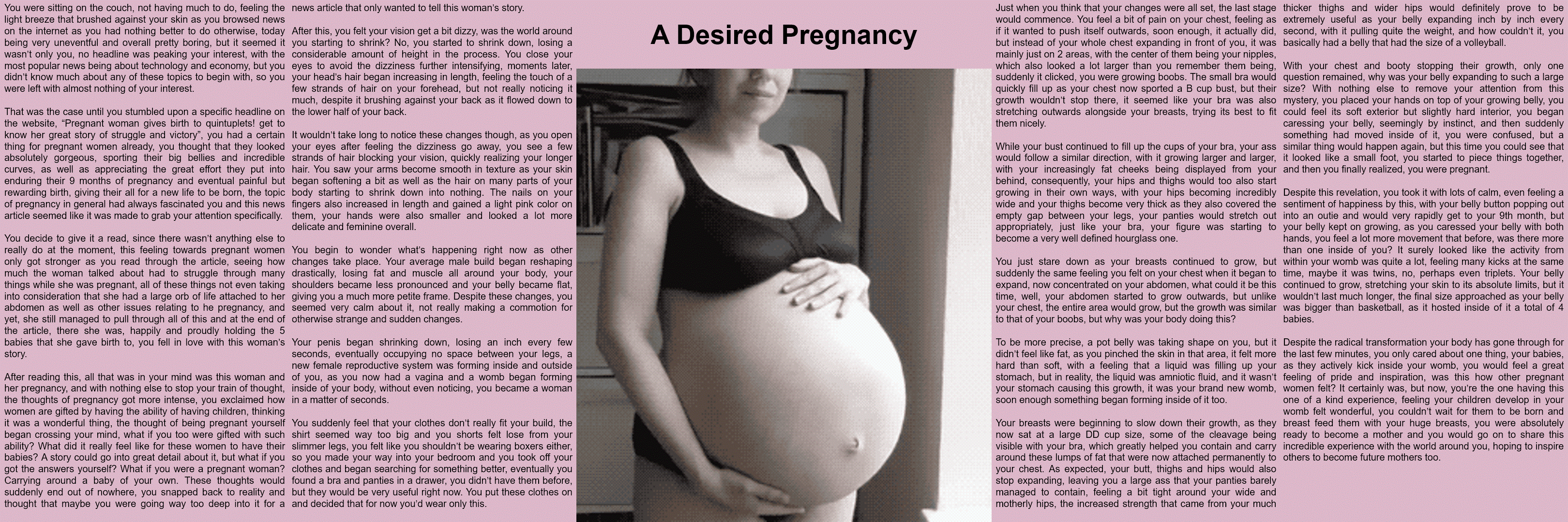 That was the case until you stumbled upon a specific headline on the website, “Pregnant woman gives birth to quintuplets! get to know her great story of struggle and victory”, you had a certain thing for pregnant women already, you thought that they looked absolutely gorgeous, sporting their big bellies and incredible curves, as well as appreciating the great effort they put into enduring their 9 months of pregnancy and eventual painful but rewarding birth, giving their all for a new life to be born, the topic of pregnancy in general had always fascinated you and this news article seemed like it was made to grab your attention specifically.