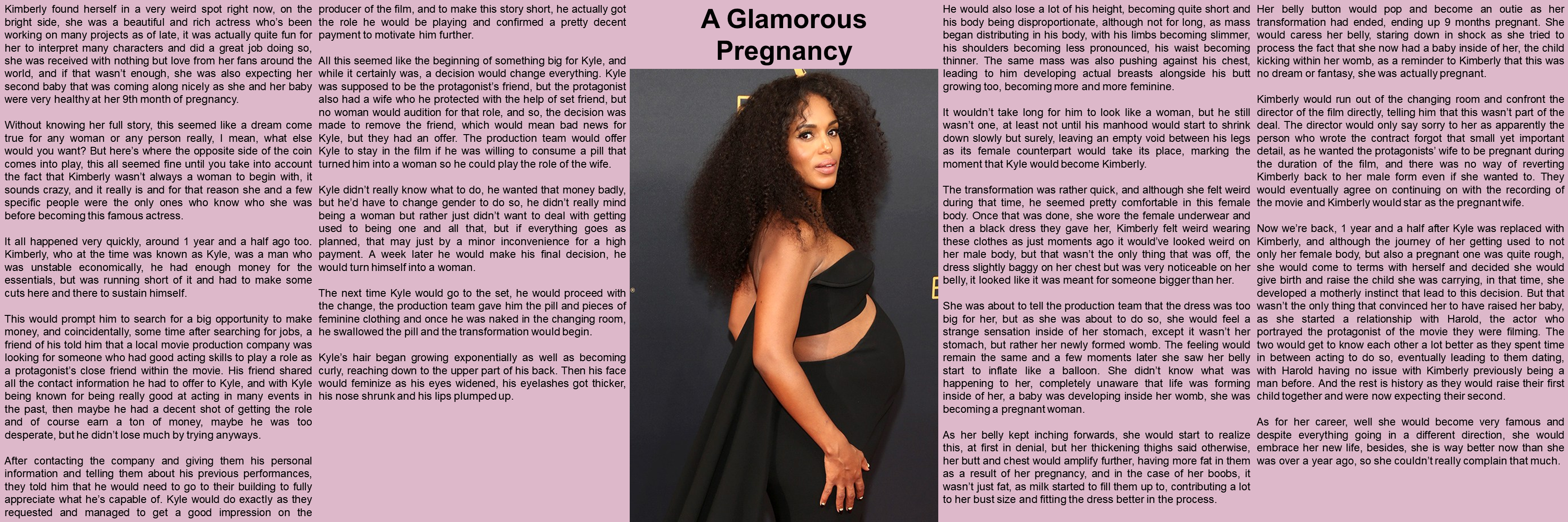 Her belly button would pop and become an outie as her transformation had ended, ending up 9 months pregnant. She would caress her belly, staring down in shock as she tried to process the fact that she now had a baby inside of her, the child kicking within her womb, as a reminder to Kimberly that this was no dream or fantasy, she was actually pregnant.