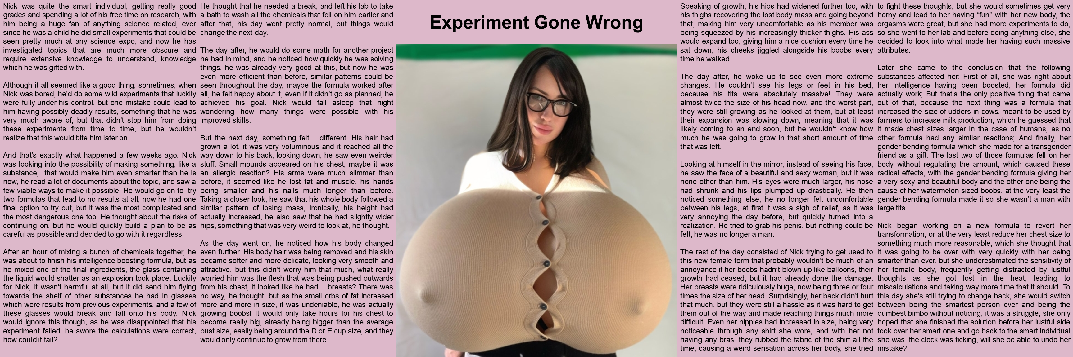 The rest of the day consisted of Nick trying to get used to this new female form that probably wouldn’t be much of an annoyance if her boobs hadn’t blown up like balloons, their growth had ceased, but it had already done the damage. Her breasts were ridiculously huge, now being three or four times the size of her head. Surprisingly, her back didn’t hurt that much, but they were still a hassle as it was hard to get them out of the way and made reaching things much more difficult. Even her nipples had increased in size, being very noticeable through any shirt she wore, and with her not having any bras, they rubbed the fabric of the shirt all the time, causing a weird sensation across her body, she tried to fight these thoughts, but she would sometimes get very horny and lead to her having “fun” with her new body, the orgasms were great, but she had more experiments to do, so she went to her lab and before doing anything else, she decided to look into what made her having such massive attributes.