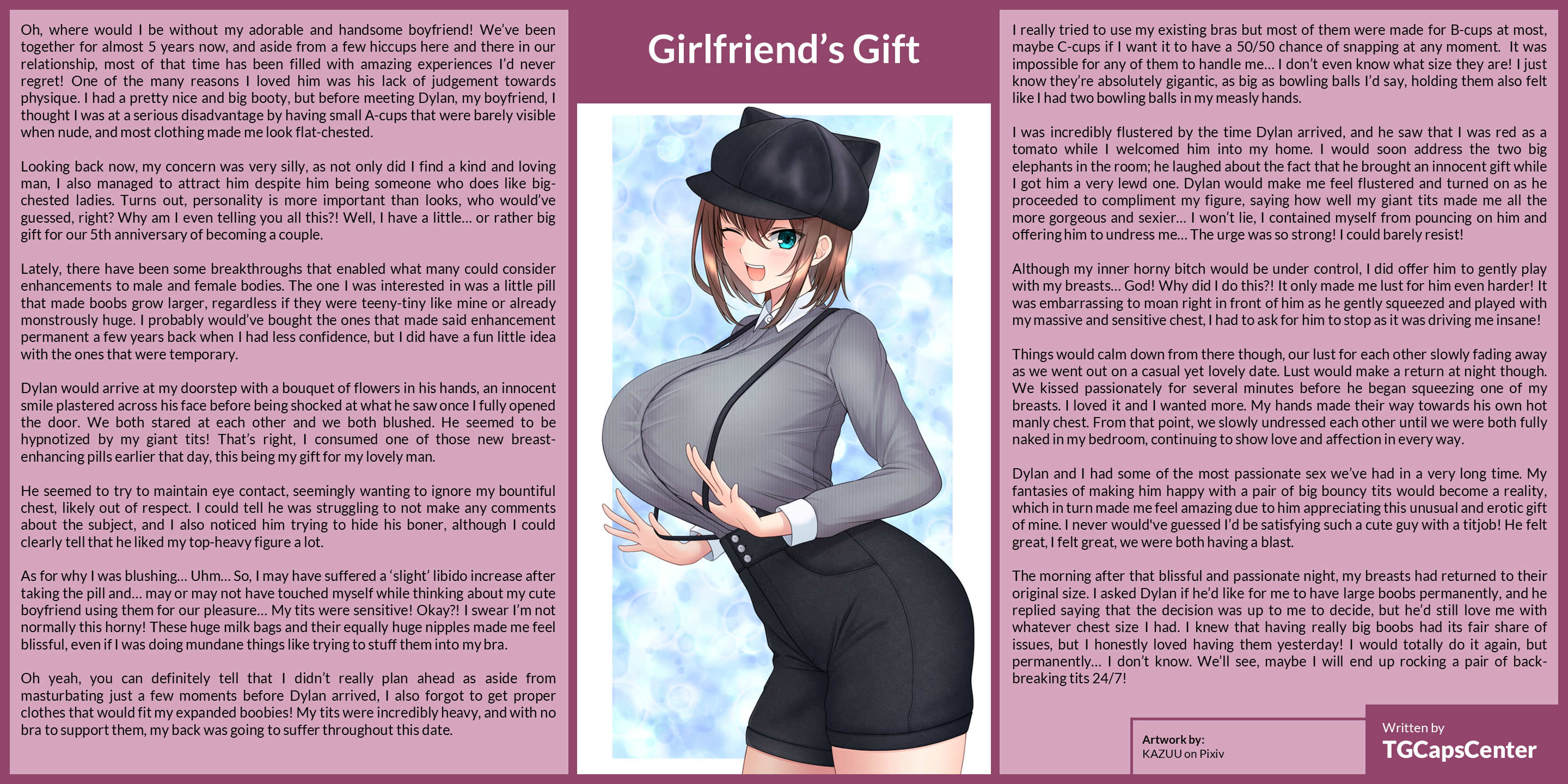 The morning after that blissful and passionate night, my breasts had returned to their original size. I asked Dylan if he’d like for me to have large boobs permanently, and he replied saying that the decision was up to me to decide, but he’d still love me with whatever chest size I had. I knew that having really big boobs had its fair share of issues, but I honestly loved having them yesterday! I would totally do it again, but permanently… I don’t know. We’ll see, maybe I will end up rocking a pair of back-breaking tits 24/7!