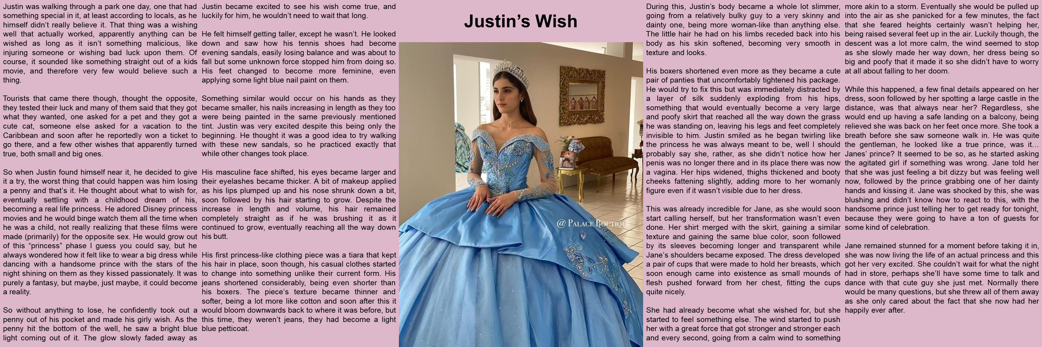 So when Justin found himself near it, he decided to give it a try, the worst thing that could happen was him losing a penny and that’s it. He thought about what to wish for, eventually settling with a childhood dream of his, becoming a real life princess. He adored Disney princess movies and he would binge watch them all the time when he was a child, not really realizing that these films were made (primarily) for the opposite sex. He would grow out of this “princess” phase I guess you could say, but he always wondered how it felt like to wear a big dress while dancing with a handsome prince with the stars of the night shining on them as they kissed passionately. It was purely a fantasy, but maybe, just maybe, it could become a reality.