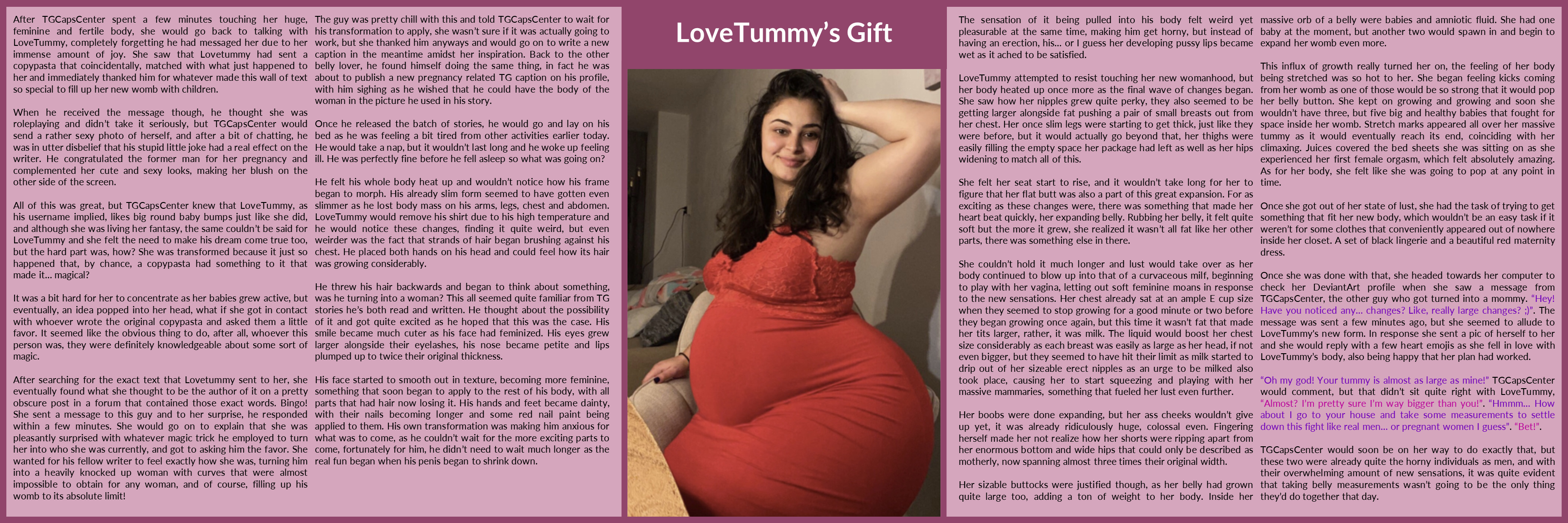 All of this was great, but TGCapsCenter knew that LoveTummy, as his username implied, likes big round baby bumps just like she did, and although she was living her fantasy, the same couldn’t be said for LoveTummy and she felt the need to make his dream come true too, but the hard part was, how? She was transformed because it just so happened that, by chance, a copypasta had something to it that made it… magical?