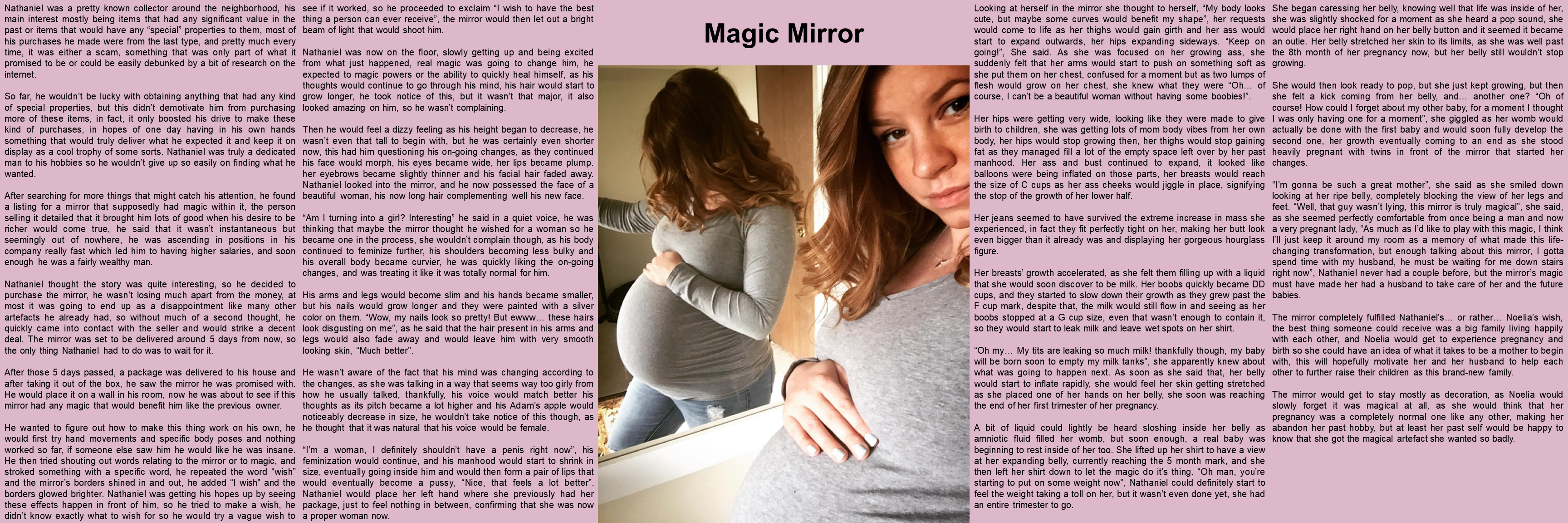 “I’m gonna be such a great mother”, she said as she smiled down looking at her ripe belly, completely blocking the view of her legs and feet. “Well, that guy wasn’t lying, this mirror is truly magical”, she said, as she seemed perfectly comfortable from once being a man and now a very pregnant lady, “As much as I’d like to play with this magic, I think I’ll just keep it around my room as a memory of what made this life-changing transformation, but enough talking about this mirror, I gotta spend time with my husband, he must be waiting for me down stairs right now”, Nathaniel never had a couple before, but the mirror’s magic must have made her had a husband to take care of her and the future babies.
