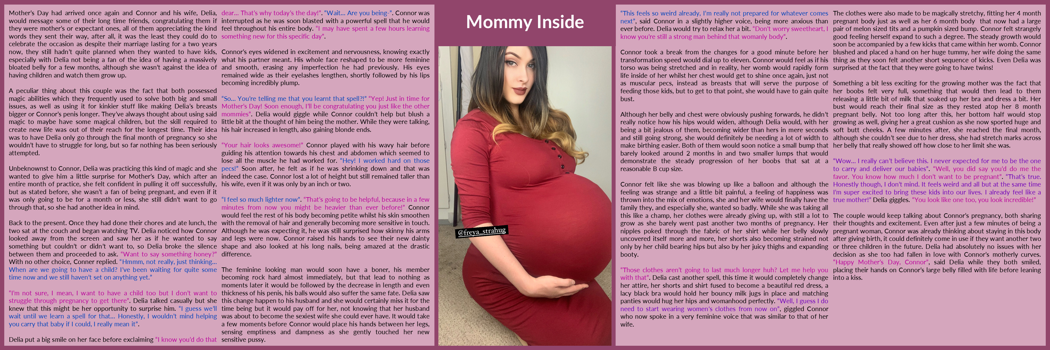 The couple would keep talking about Connor’s pregnancy, both sharing their thoughts and excitement. Even after just a few minutes of being a pregnant woman, Connor was already thinking about staying in this body after giving birth, it could definitely come in use if they want another two or three children in the future. Delia had absolutely no issues with her decision as she too had fallen in love with Connor’s motherly curves. “Happy Mother’s Day, Connor”, said Delia while they both smiled, placing their hands on Connor’s large belly filled with life before leaning into a kiss.