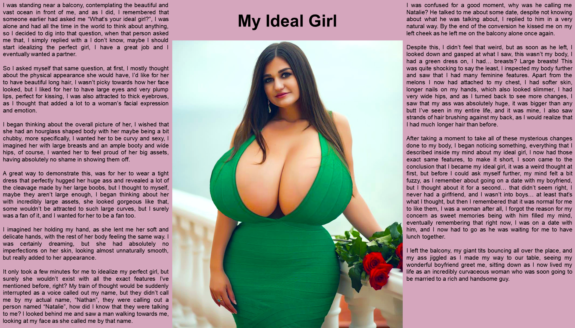 After taking a moment to take all of these mysterious changes done to my body, I began noticing something, everything that I described inside my mind about my ideal girl, I now had those exact same features, to make it short, I soon came to the conclusion that I became my ideal girl, it was a weird thought at first, but before I could ask myself further, my mind felt a bit fuzzy, as I remember about going on a date with my boyfriend, but I thought about it for a second… that didn’t seem right, I never had a girlfriend, and I wasn’t into boys… at least that’s what I thought, but then I remembered that it was normal for me to like them, I was a woman after all, I forgot the reason for my concern as sweet memories being with him filled my mind, eventually remembering that right now, I was on a date with him, and I now had to go as he was waiting for me to have lunch together.