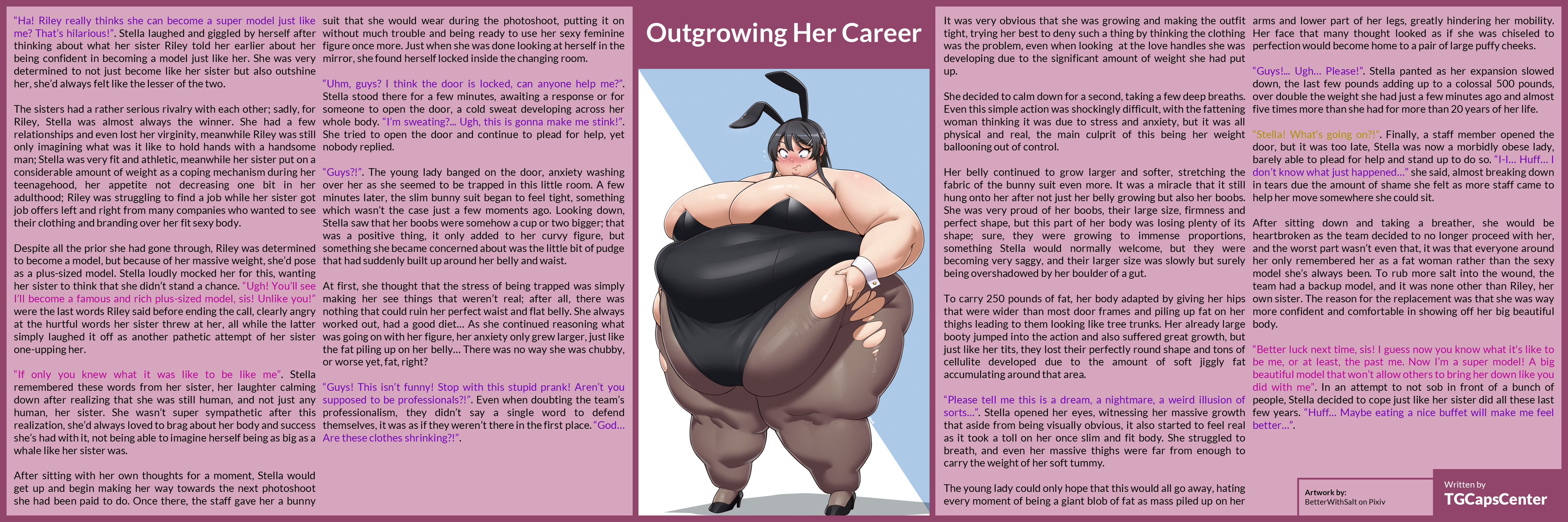 “Guys?!”. The young lady banged on the door, anxiety washing over her as she seemed to be trapped in this little room. A few minutes later, the slim bunny suit began to feel tight, something which wasn’t the case just a few moments ago. Looking down, Stella saw that her boobs were somehow a cup or two bigger; that was a positive thing, it only added to her curvy figure, but something she became concerned about was the little bit of pudge that had suddenly built up around her belly and waist.