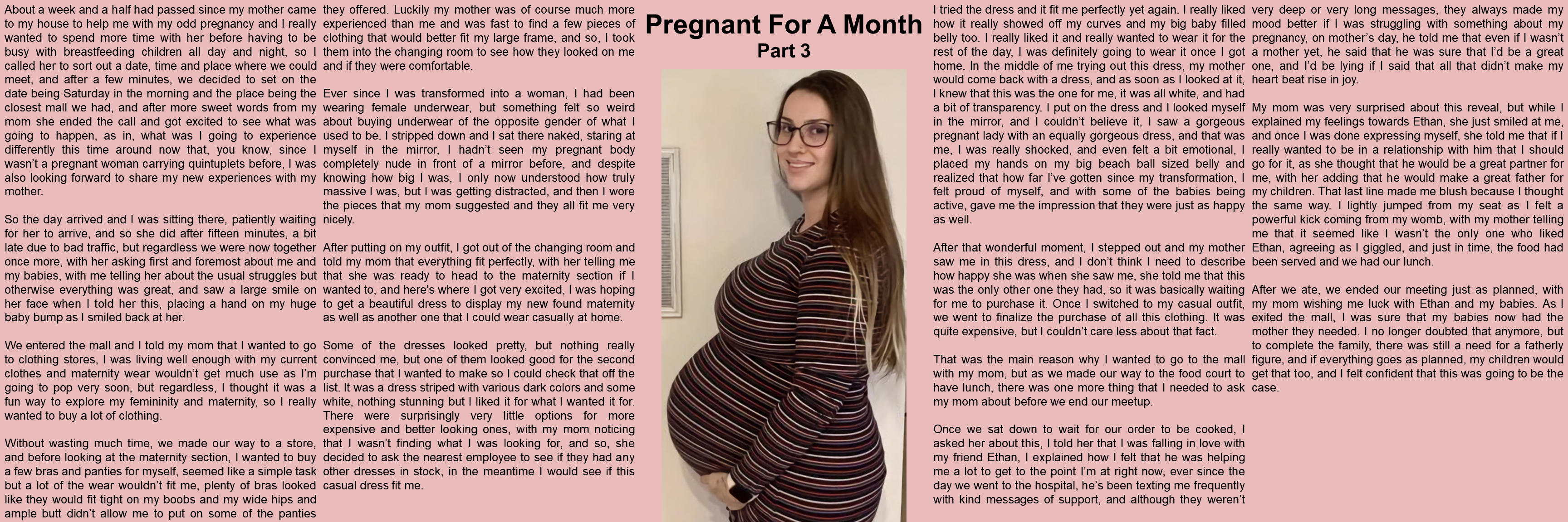 Ever since I was transformed into a woman, I had been wearing female underwear, but something felt so weird about buying underwear of the opposite gender of what I used to be. I stripped down and I sat there naked, staring at myself in the mirror, I hadn’t seen my pregnant body completely nude in front of a mirror before, and despite knowing how big I was, I only now understood how truly massive I was, but I was getting distracted, and then I wore the pieces that my mom suggested and they all fit me very nicely.