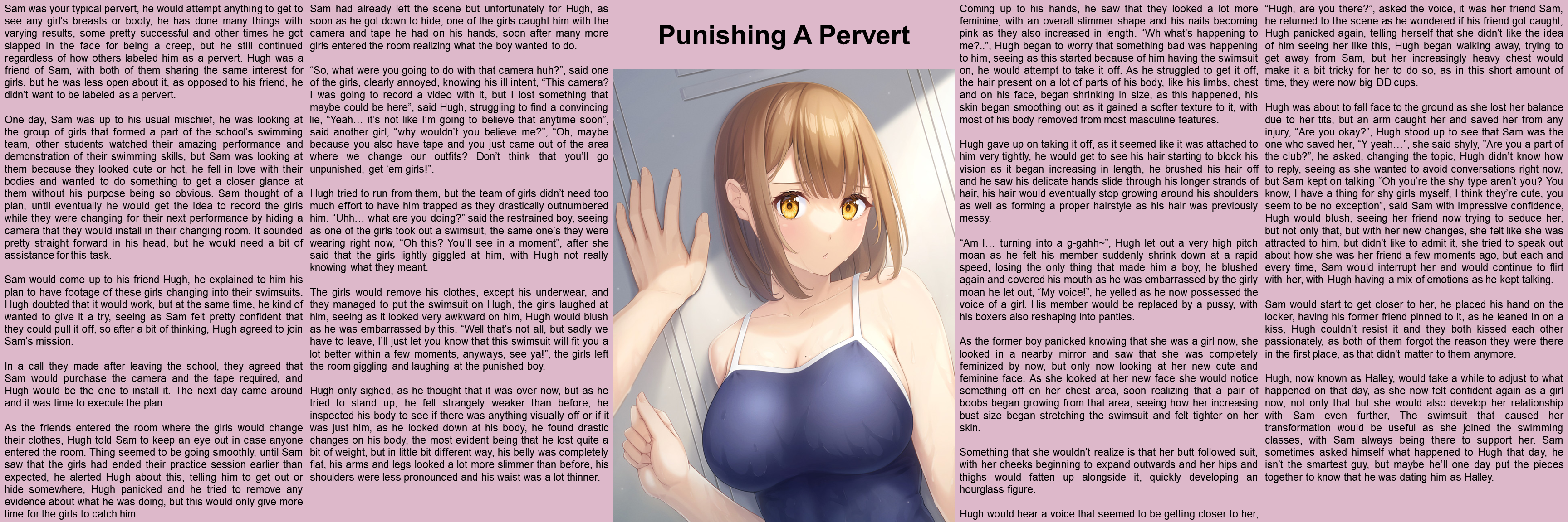 Coming up to his hands, he saw that they looked a lot more feminine, with an overall slimmer shape and his nails becoming pink as they also increased in length. “Wh-what’s happening to me?..”, Hugh began to worry that something bad was happening to him, seeing as this started because of him having the swimsuit on, he would attempt to take it off. As he struggled to get it off, the hair present on a lot of parts of his body, like his limbs, chest and on his face, began shrinking in size, as this happened, his skin began smoothing out as it gained a softer texture to it, with most of his body removed from most masculine features.