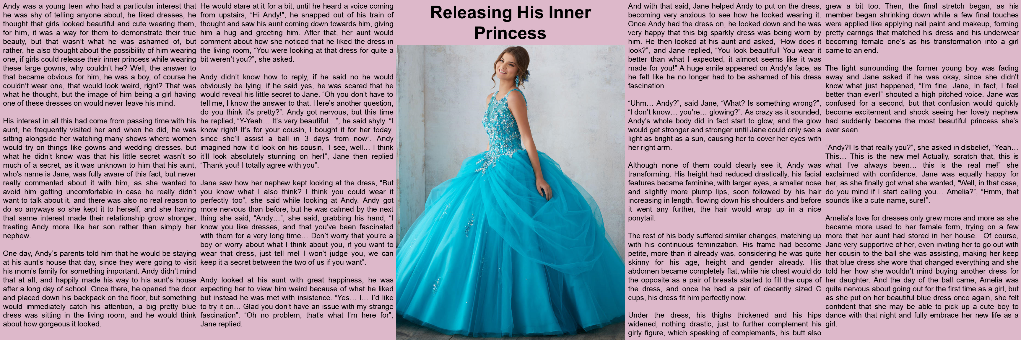 Andy was a young teen who had a particular interest that he was shy of telling anyone about, he liked dresses, he thought that girls looked beautiful and cute wearing them, for him, it was a way for them to demonstrate their true beauty, but that wasn’t what he was ashamed of, but rather, he also thought about the possibility of him wearing one, if girls could release their inner princess while wearing these large gowns, why couldn’t he? Well, the answer to that became obvious for him, he was a boy, of course he couldn’t wear one, that would look weird, right? That was what he thought, but the image of him being a girl having one of these dresses on would never leave his mind.